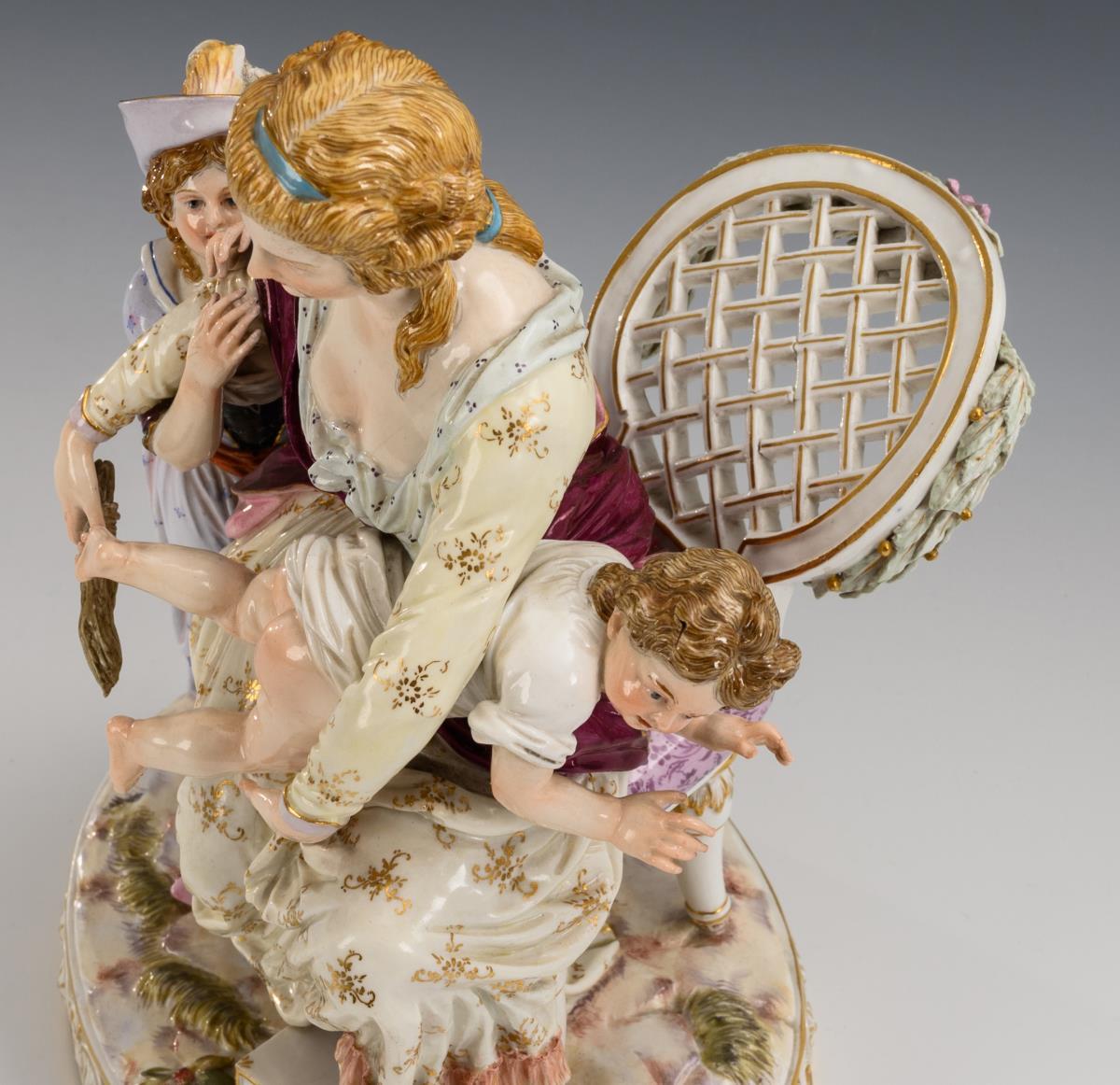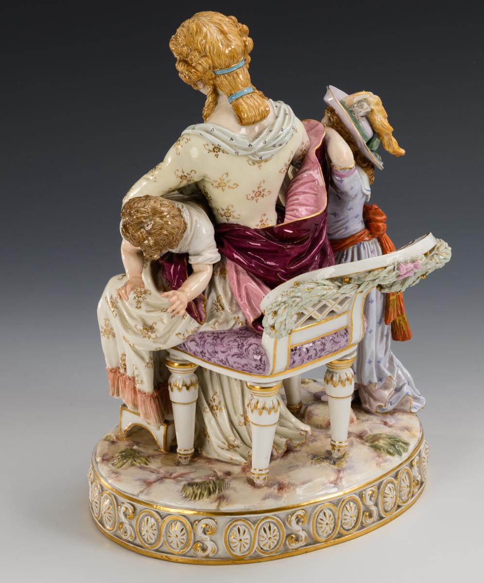 Mother sitting on a chair, chastising the child lying over her knees. 1 hairline crack and small burn marks in the back of the chair, the girl's hat feather and 1 finger of the boy chipped.