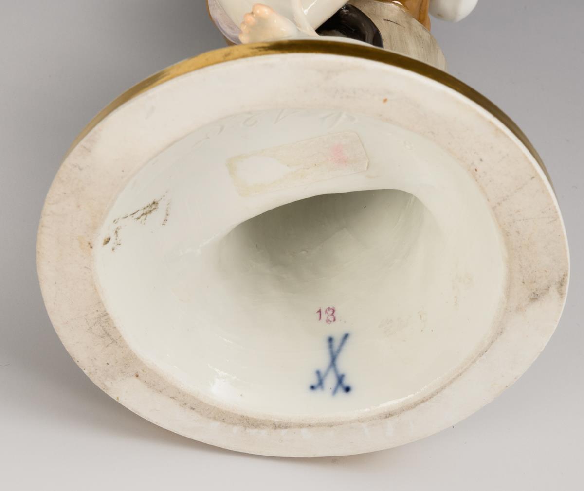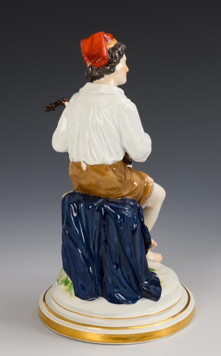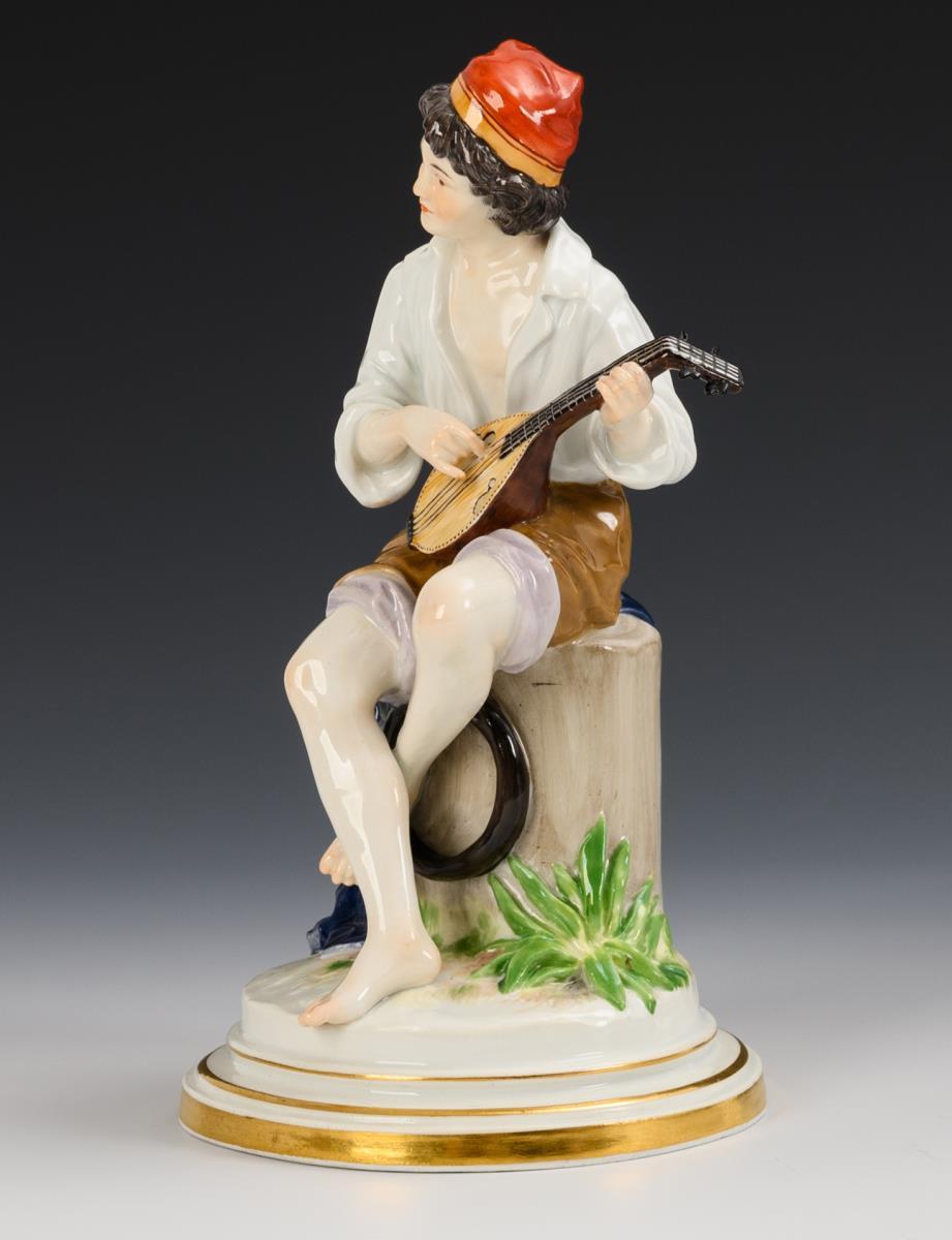 Boy sitting on a tree trunk playing a mandolin. Mandolin neck and left hand restored.