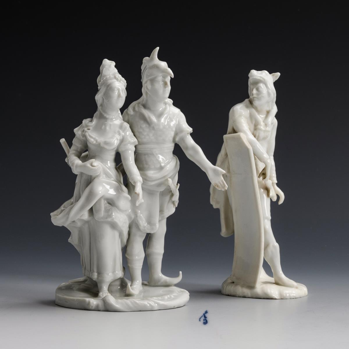 1x pair of figures "Hermann and Thusnelda": Woman with hennin and man as soldier with animal skin. / 1x figure of a soldier with animal skin, sword and shield. Both swords, 2 thumbs, 1 animal ear and shield bumped.