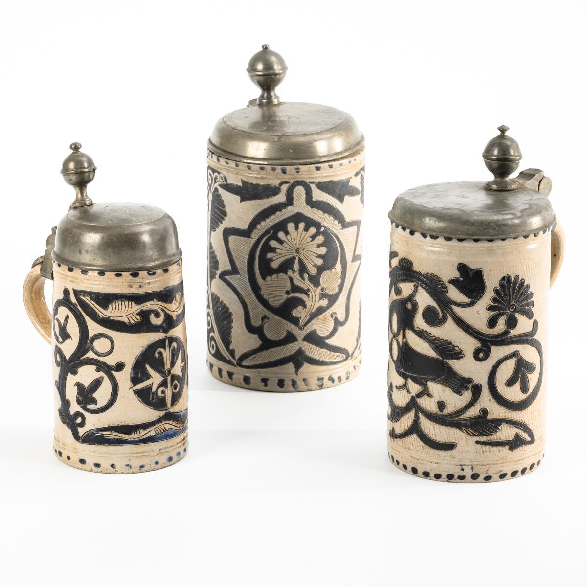 3 Westerwald roller jugs with elaborate animal and floral ornamentation.