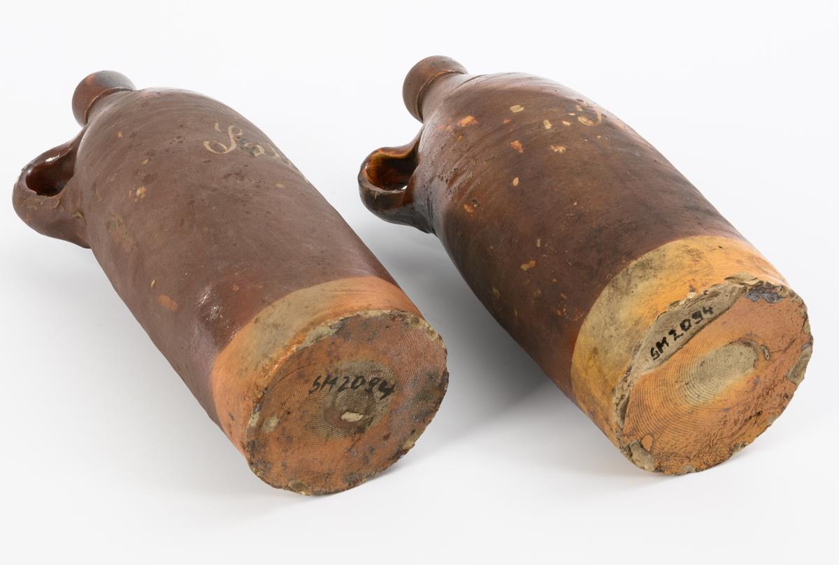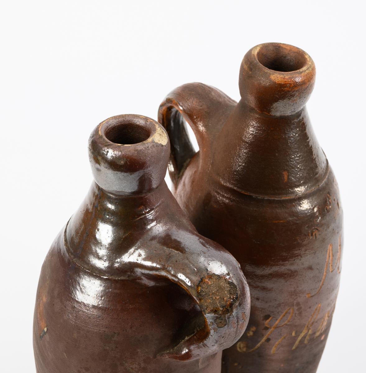 2 narrow-necked bottles with ear handles and incised names ("M. Scholze" and "A. Salzbrenner"), partly stamped. With knocks.