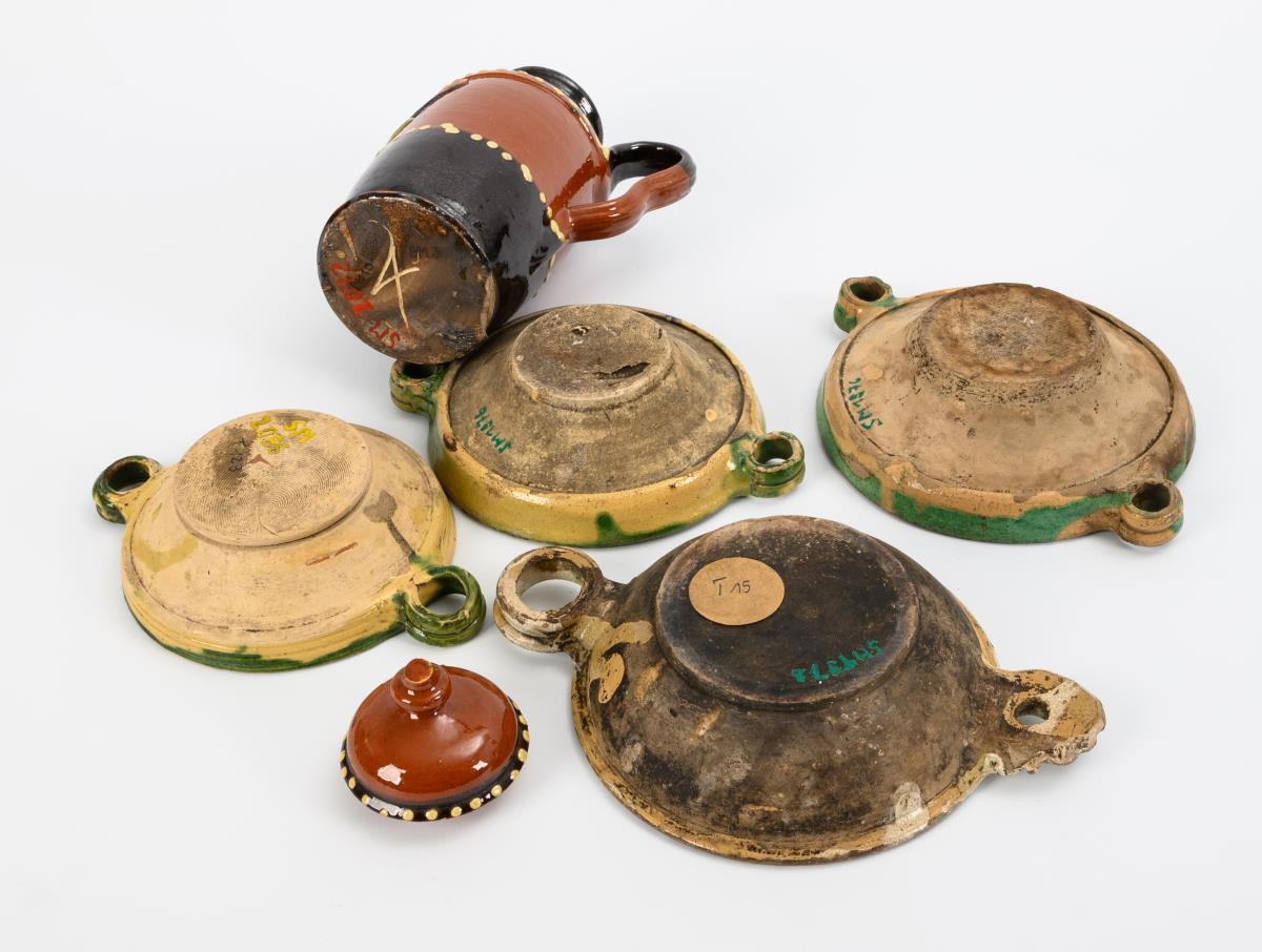 Cylinder jug with ear handle and lid, h 22 cm. 3 green and 1 white bowls with handles, L 19.5 to 24 cm. Signs of age and wear, some defects.