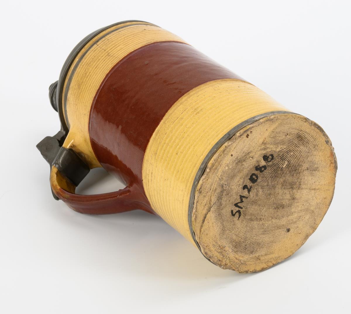 Cylindrical vessel with parallel grooves in the upper and lower area, two-tone ribbon handle. Domed pewter lid with ball pusher, engraved "AL 7", punched inside, pewter bands. 3 fine mouth cracks and 1 chip, base edge chipped.