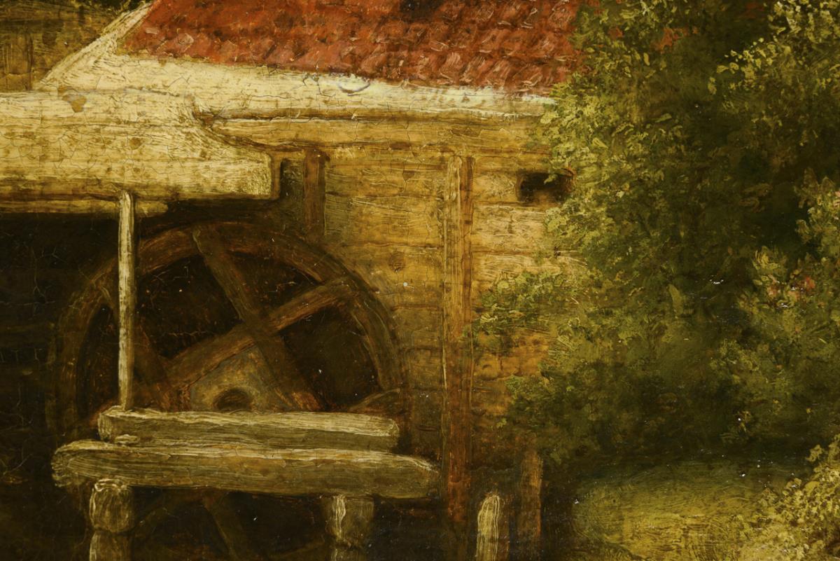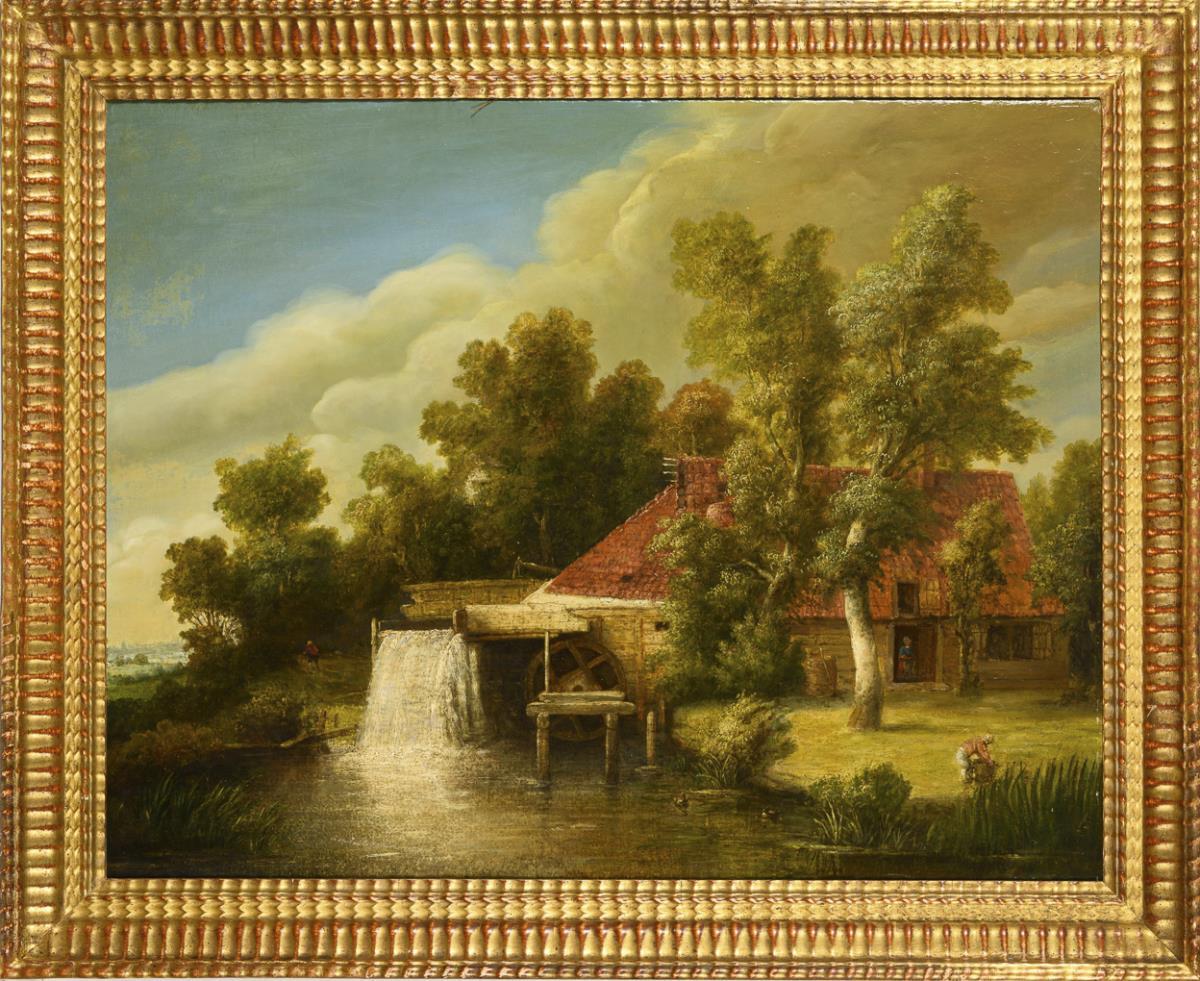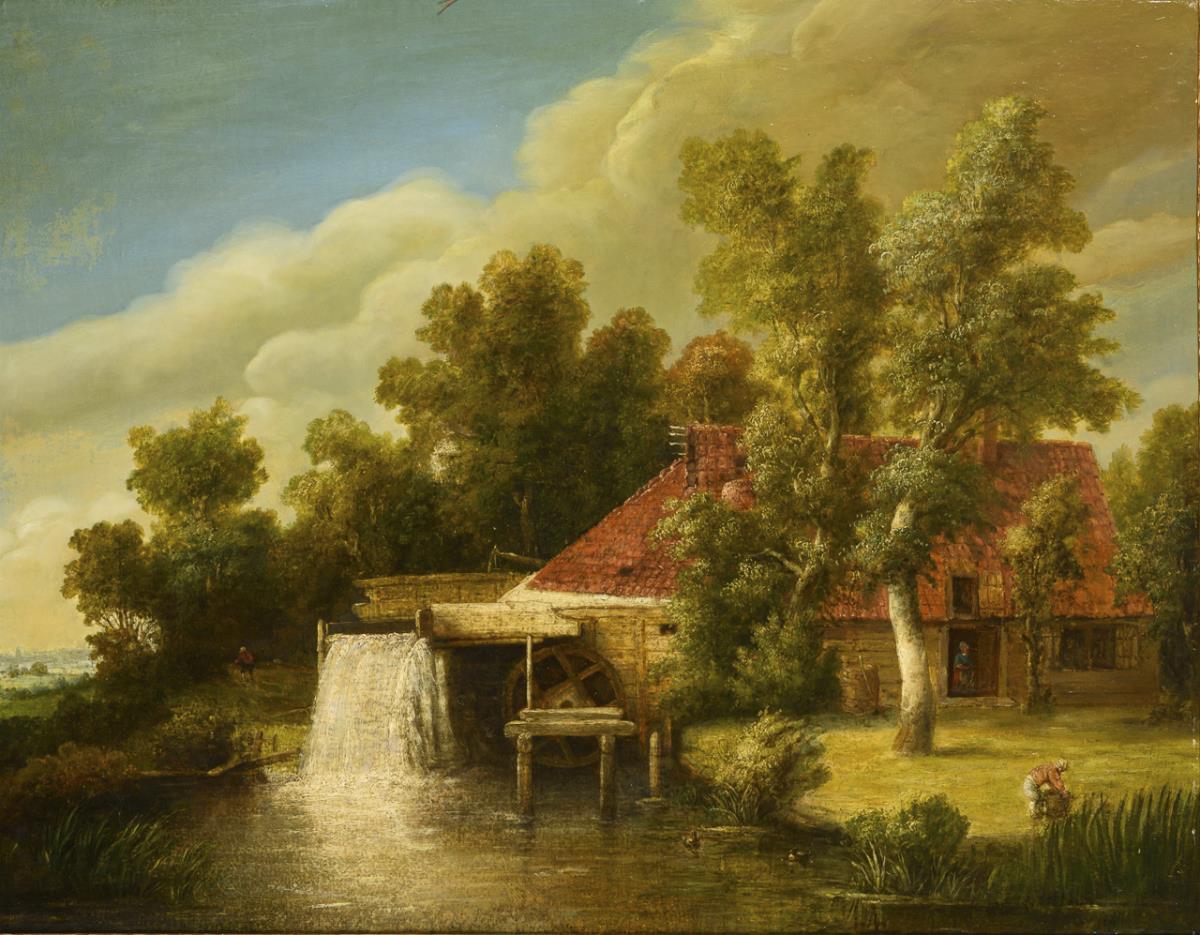 Farmhouse with watermill by the river in front of the forest under a cloudy sky. Canvas laid down.