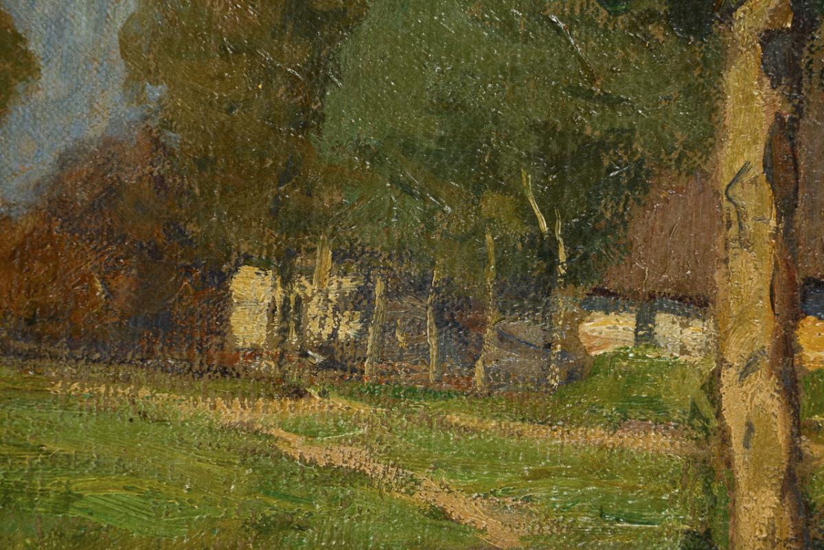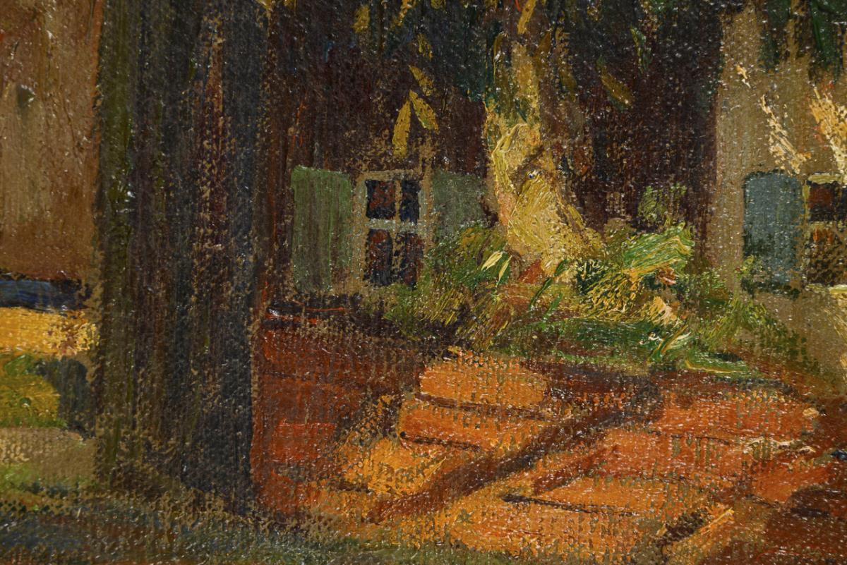 Warm sunshine over the thatched houses under a blue sky. Restored with backing.