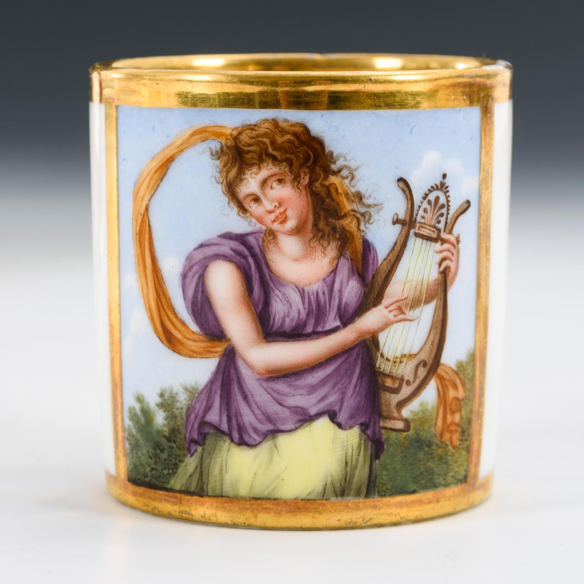 Schauseitig eine Rechteckkartusche mit der Darstellung einer lyraspielenden Dame.