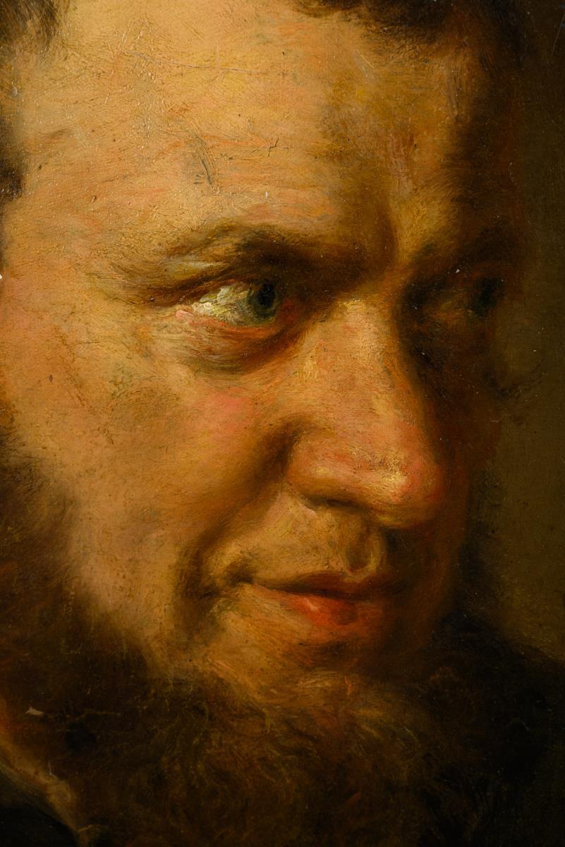 Portrait of a man with a beard and in dark clothing against a neutral background. Canvas mounted.