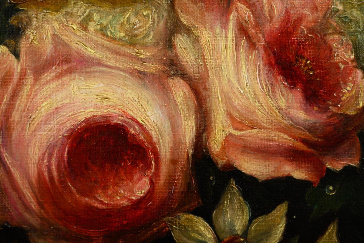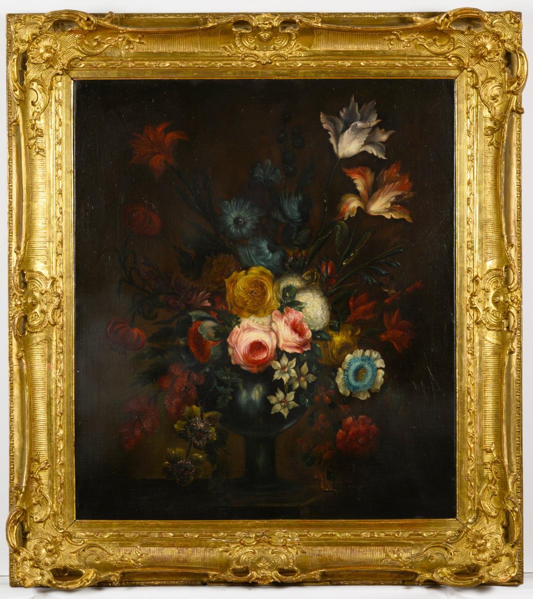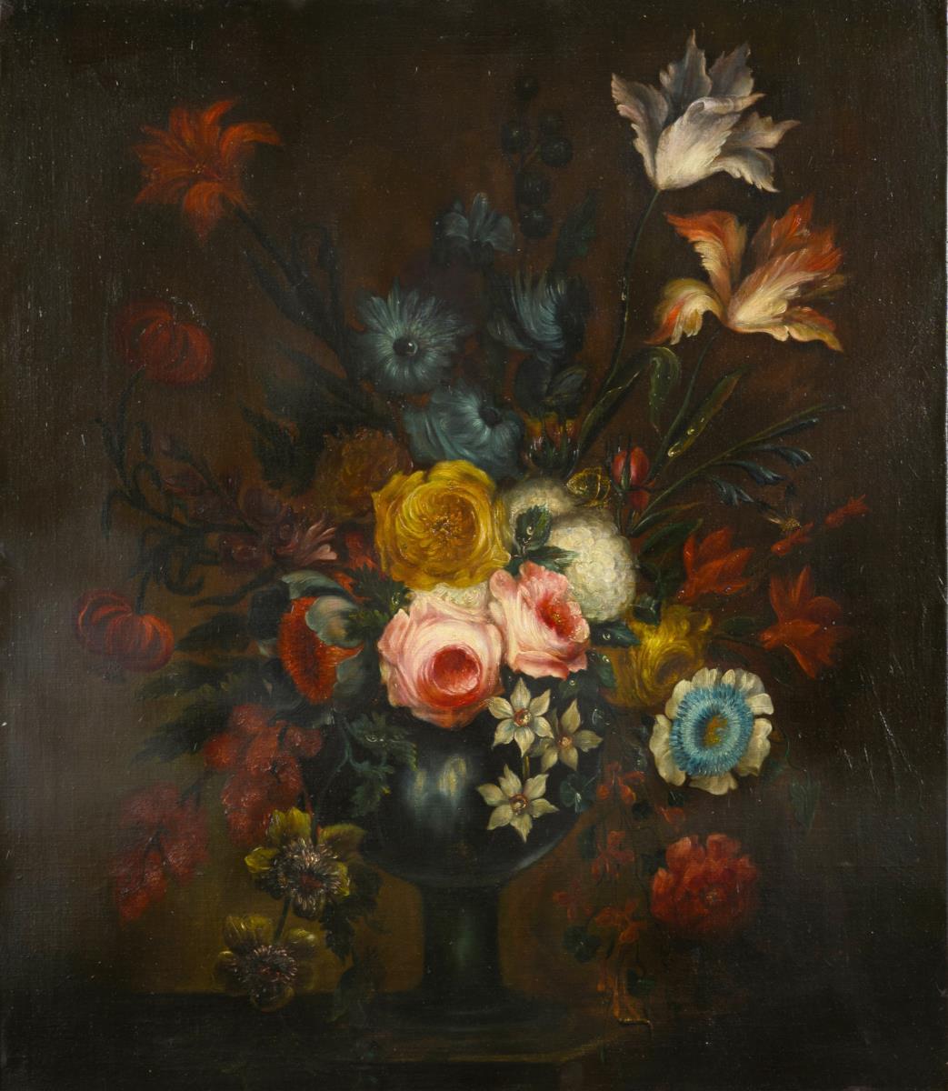 Flower still life in the style of the Old Masters with a lush bouquet in a dark vase. One small restored area with backing.