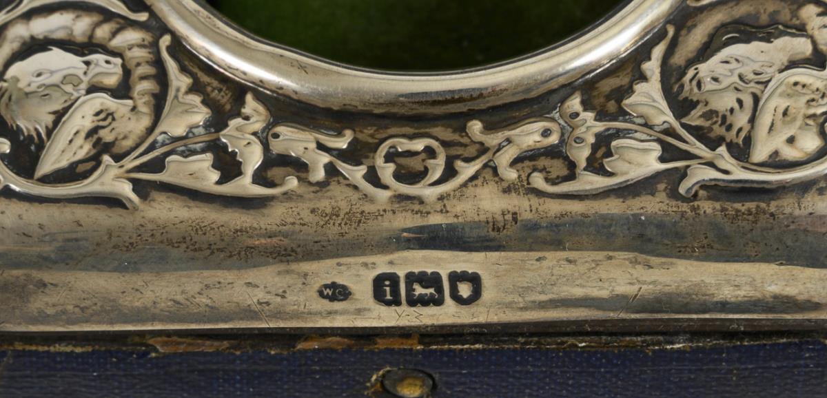 1x English watch stand, 8.5 x 8 cm. / 2x glazed, round table frame with bow finial, Ø 12.5 cm/15 cm. Signs of wear. Clock stand without glass, clasp defective.