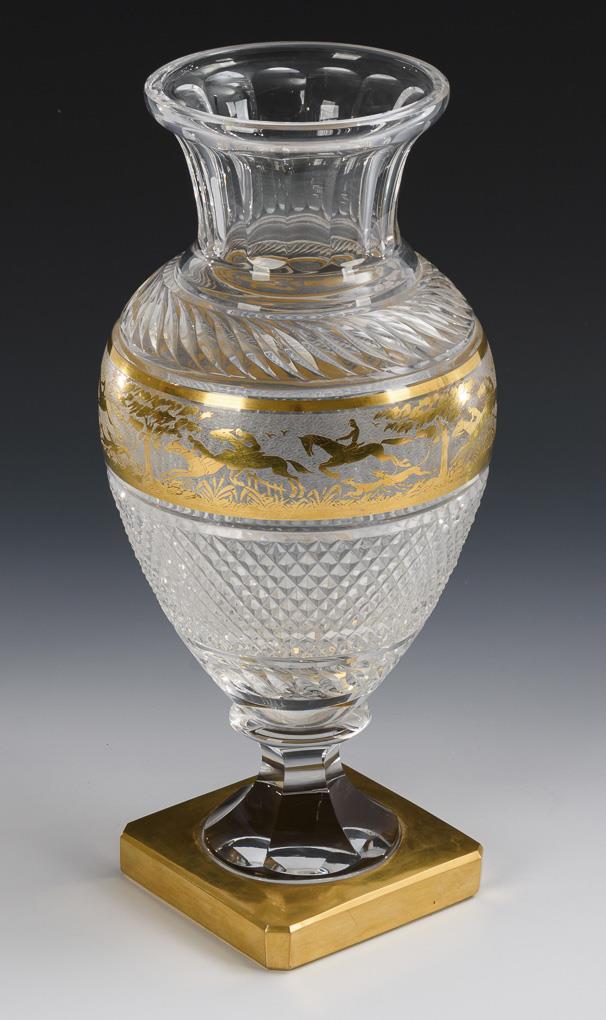 Colorless glass, facet, notch and stone cut, etched gold decoration. H 36.5 cm.