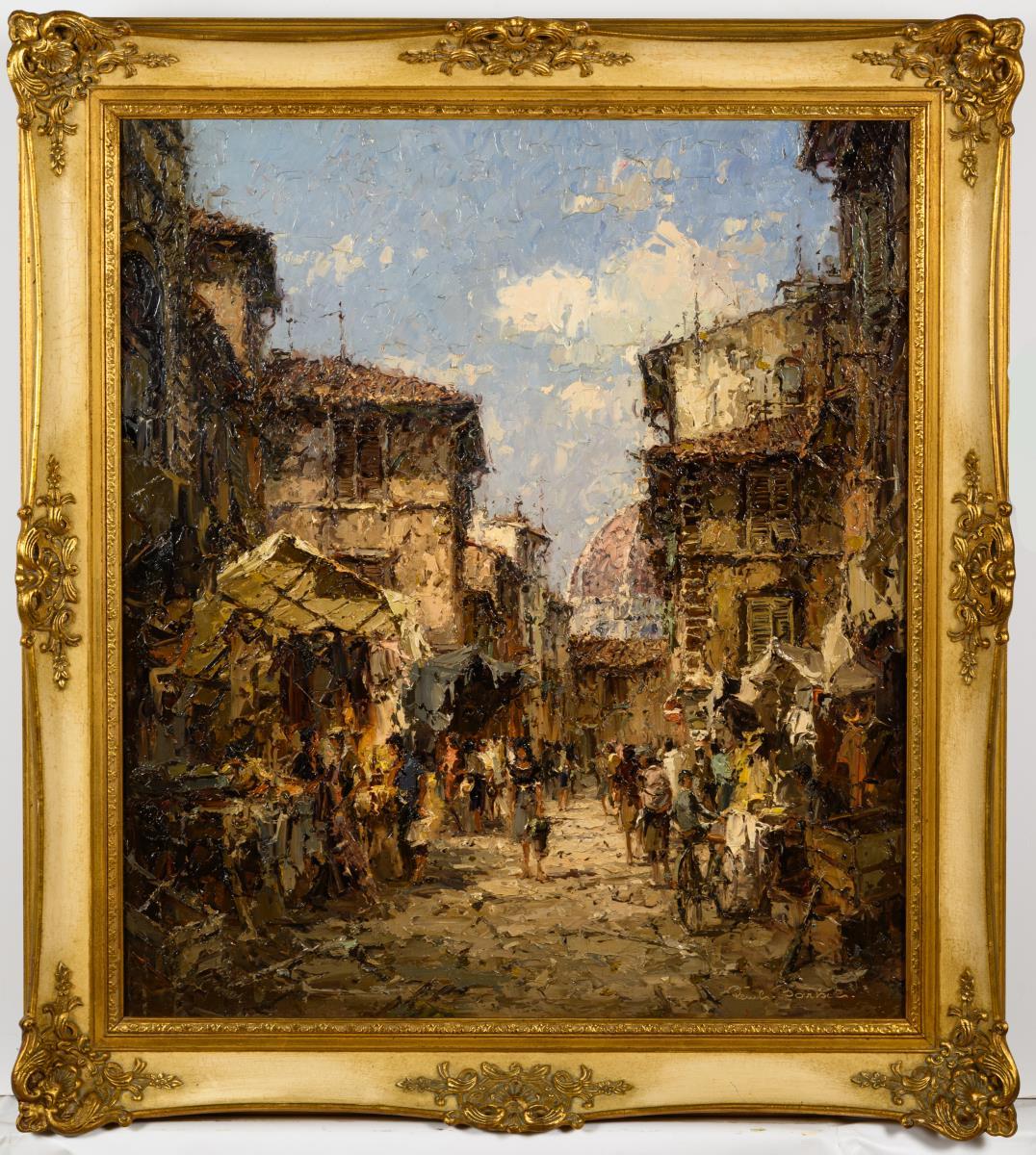 Many people in the street between the merchants' stalls with a view of the cathedral dome in the sunshine.