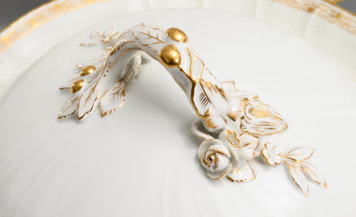 White with gold decoration. Lidded bowl (Ø 28 cm), oval plate (L 50.5 cm).