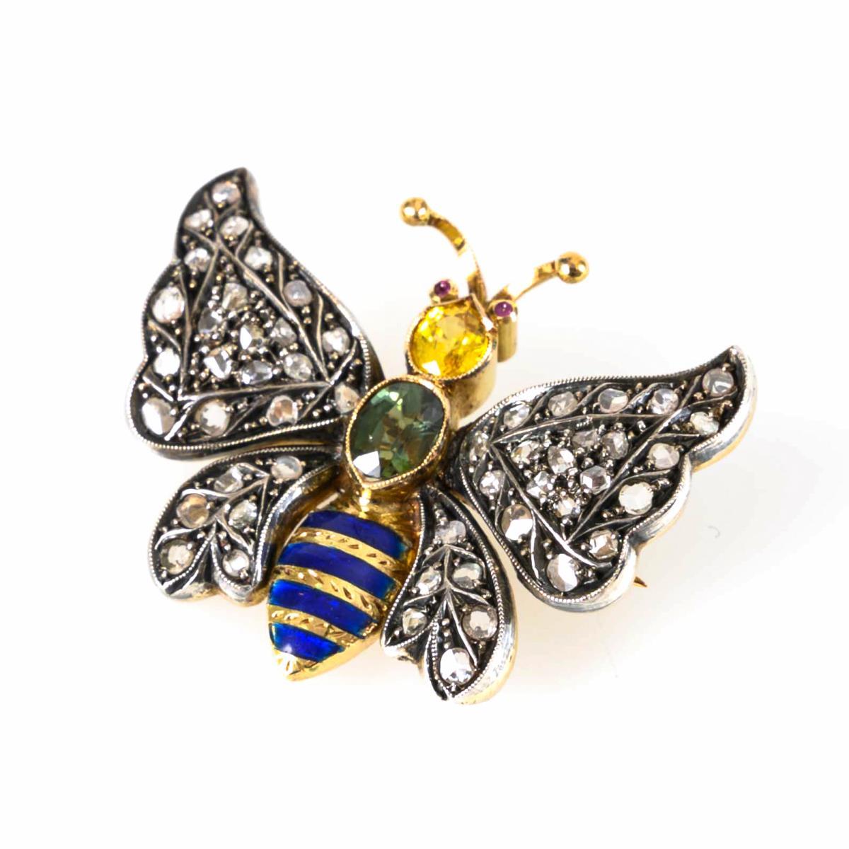 Brooch "Butterfly" with old-cut diamonds and colored stones.