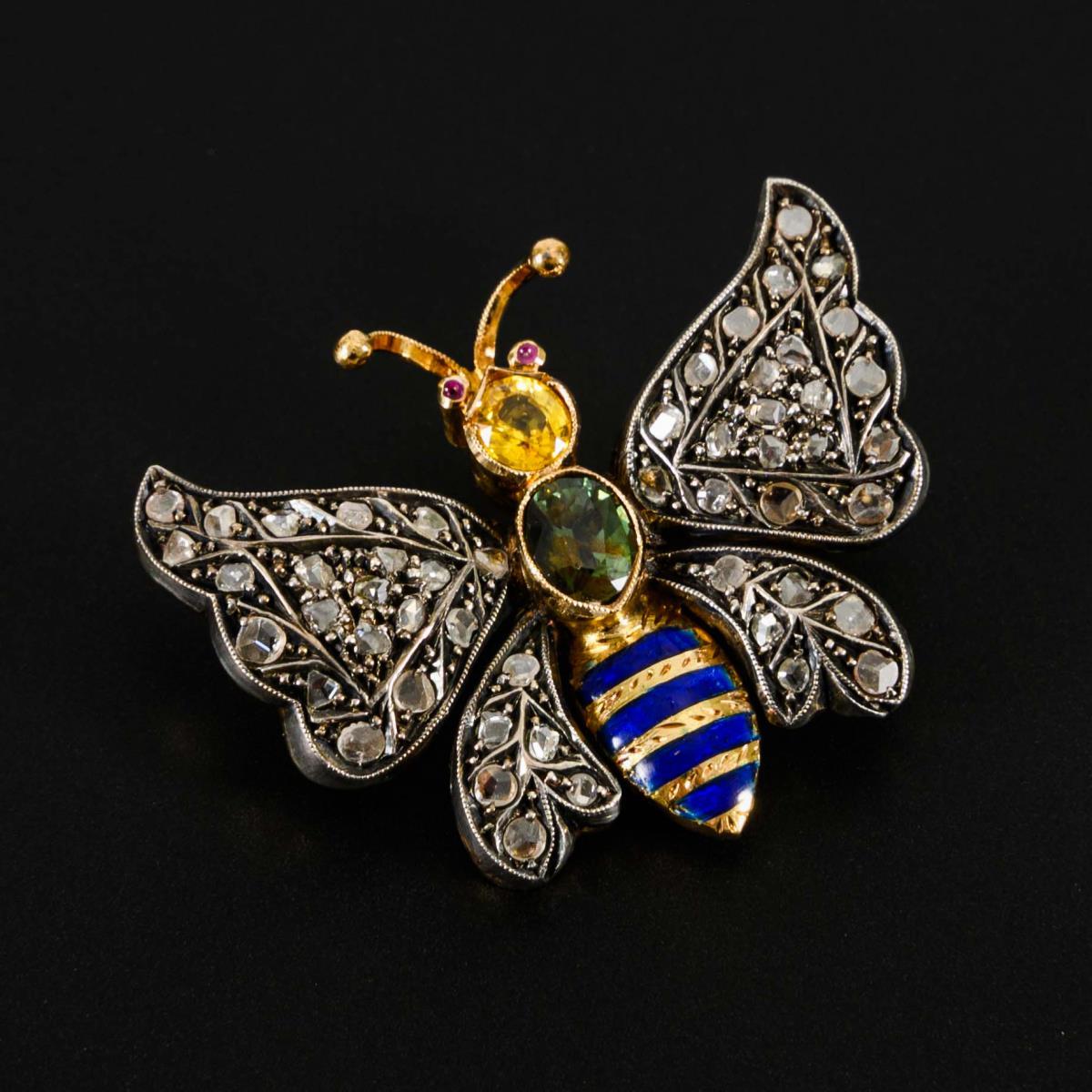 Brooch "Butterfly" with old-cut diamonds and colored stones.