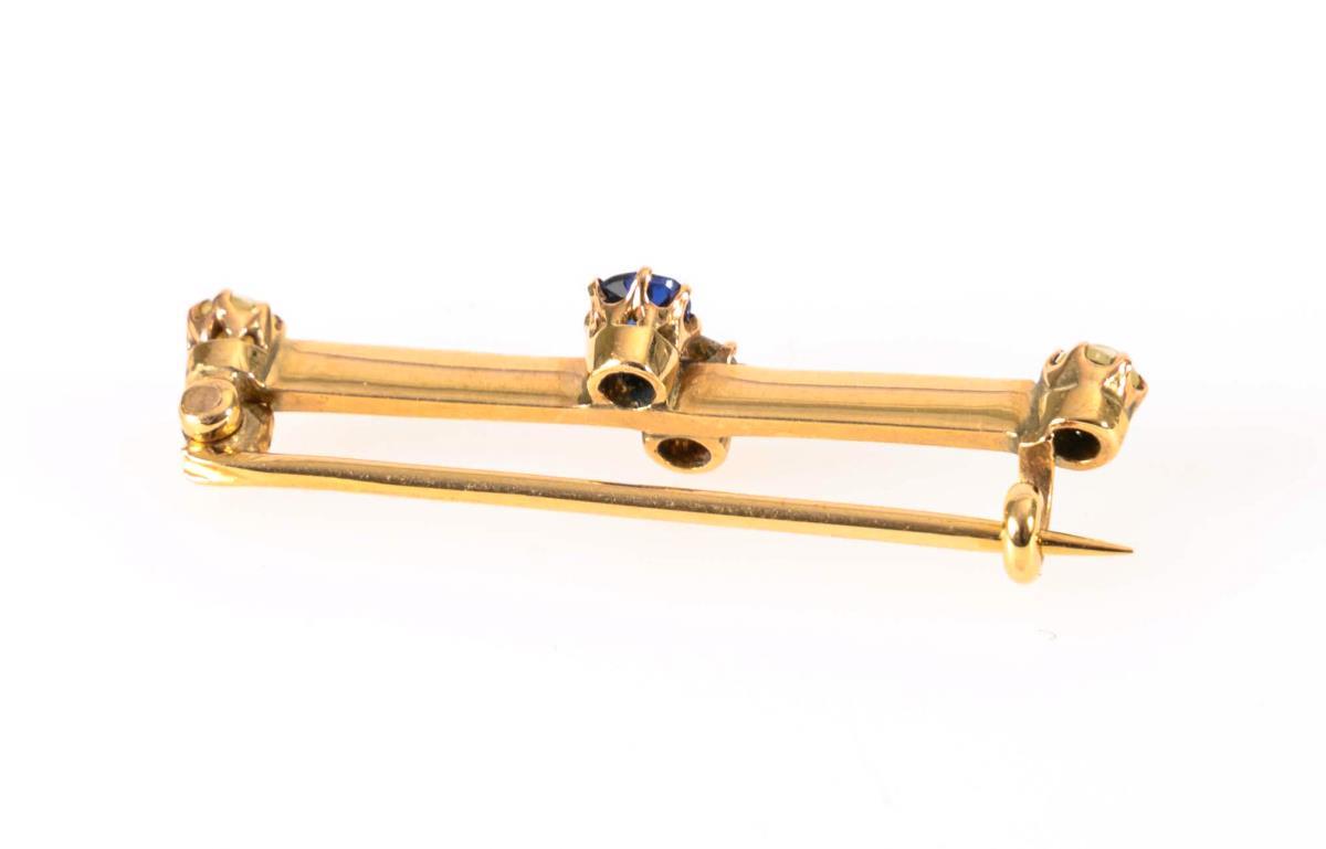 Small, chaton-set sapphire, diamond and 2 half pearls, on a narrow bar. Hook clasp.