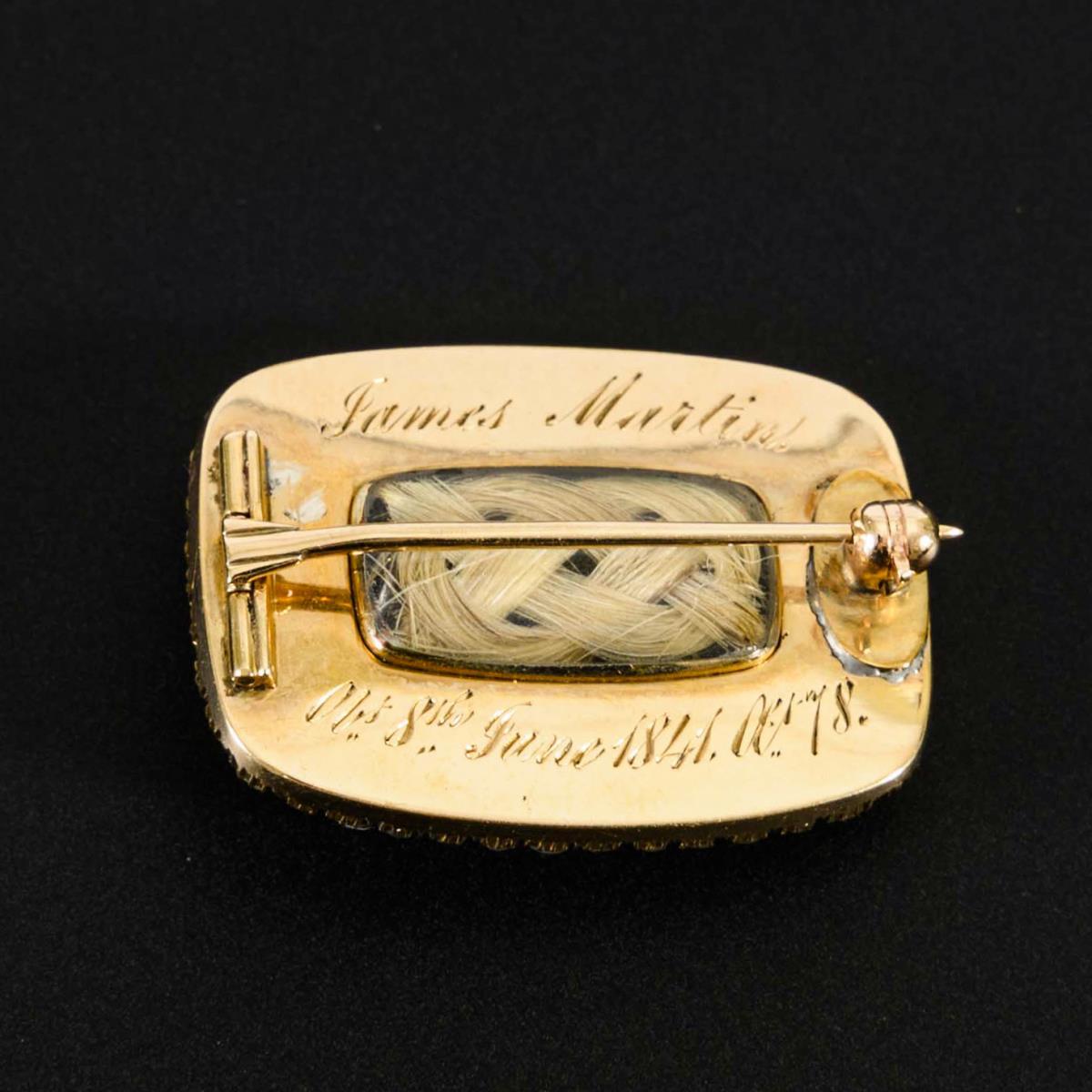 Blossom mounted on onyx inlay with small diamond roses, surrounded by 2 rows of pearls. Framed glazed compartment on the back with inlaid hair braid and engravings. Ball hook.
