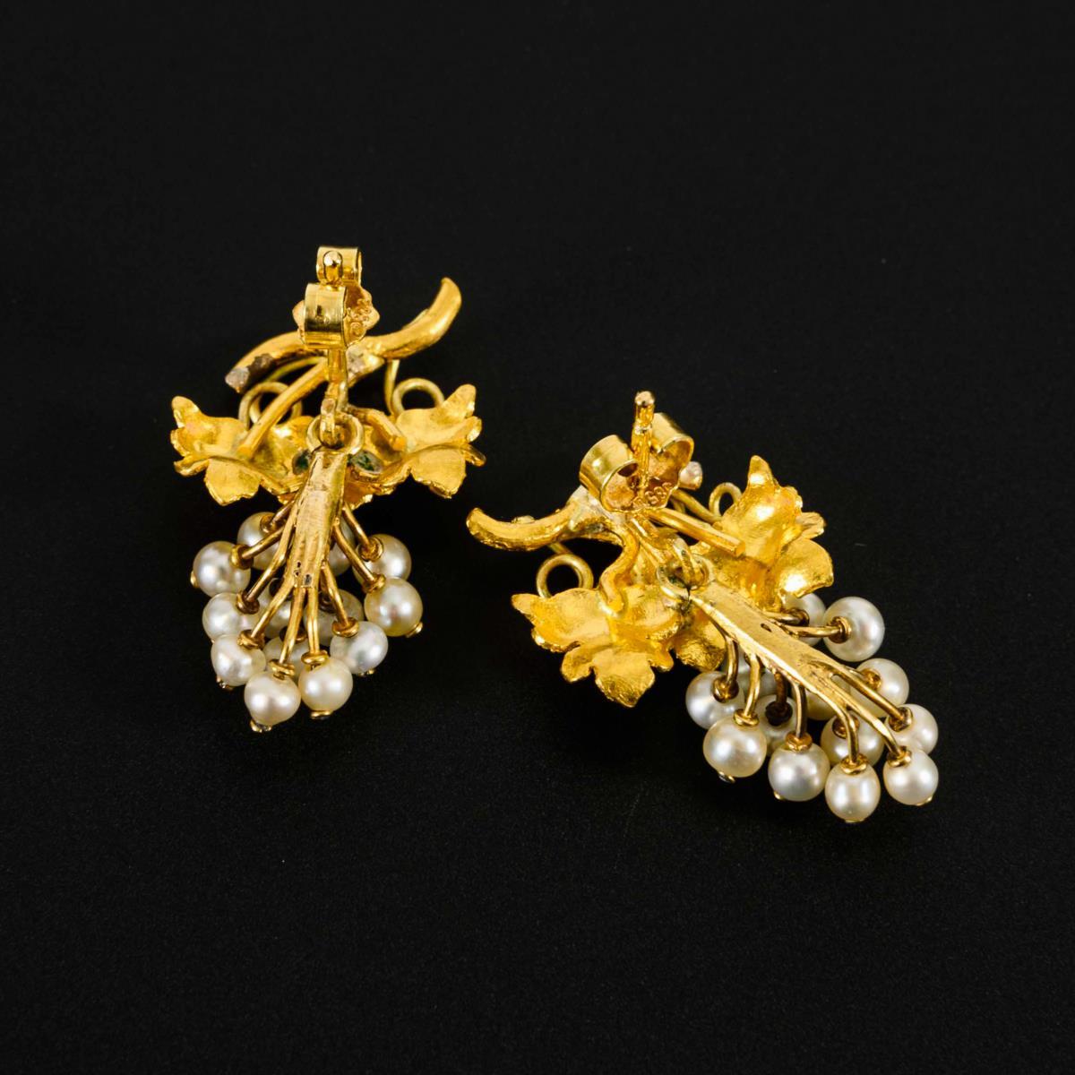 Sculptural vine leaf bristle with pearl-studded grape pendant. Plug-in mechanism.