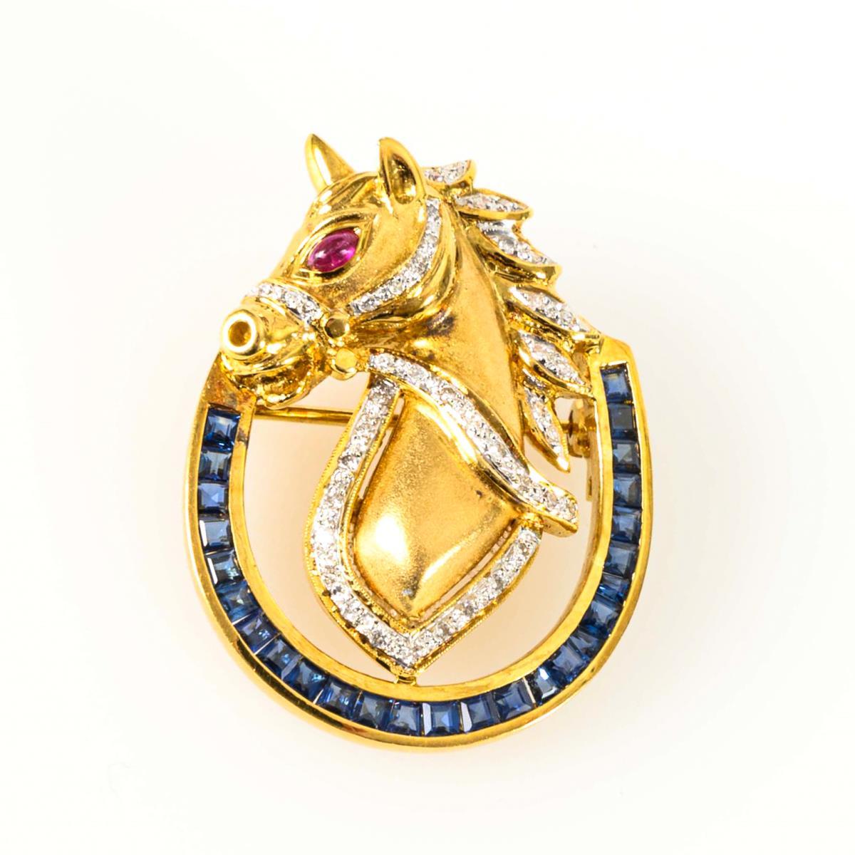 Semi-plastic horse head and horseshoe-shaped frame, set with 42 brilliant-cut diamonds, 26 sapphire carrés and ruby cabochon. Ball hook. Rigid eyelet.