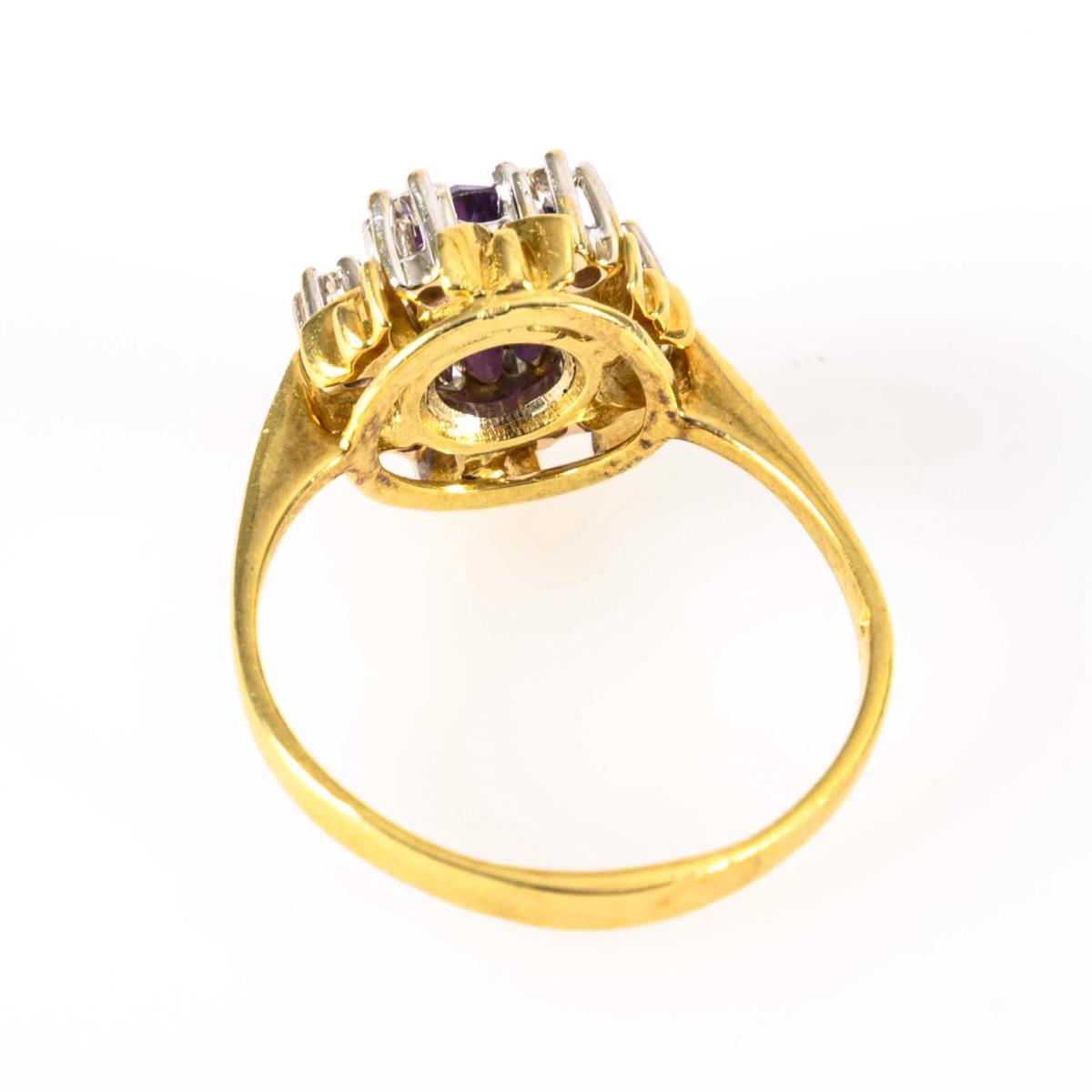 Chaton-set amethyst, surrounded by 6 diamonds, between narrow rail. 1 prong bent at diamond.