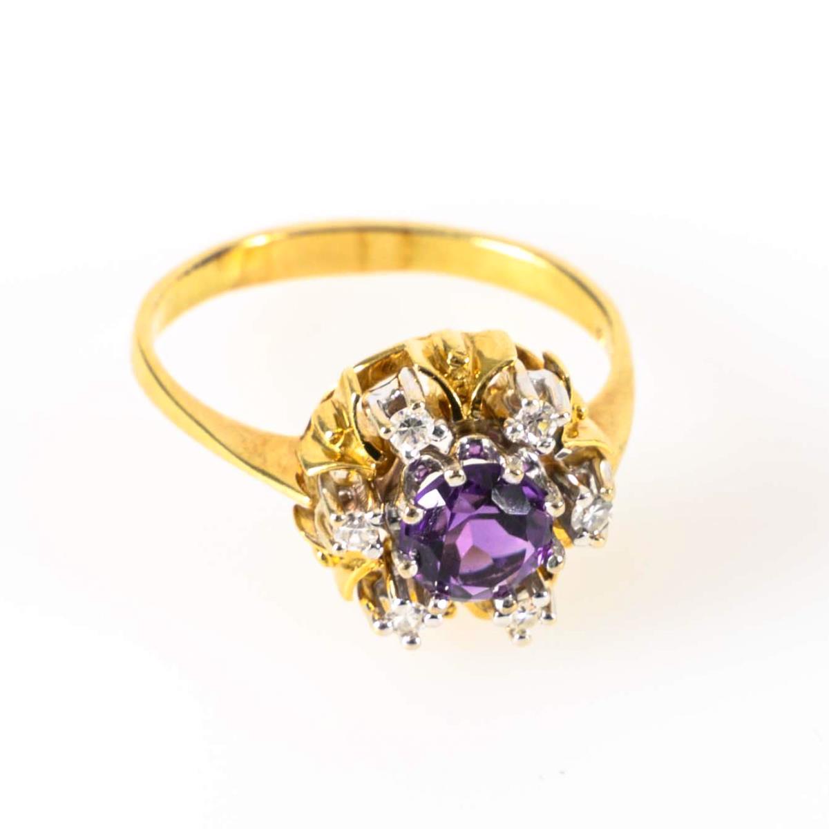 Marked yellow gold/white gold 585. Amethyst Ø 6 mm, approx. 0.70 ct. 8/8 diamonds in total approx. 0.10 ct. Ring size 58. 4.8 g.