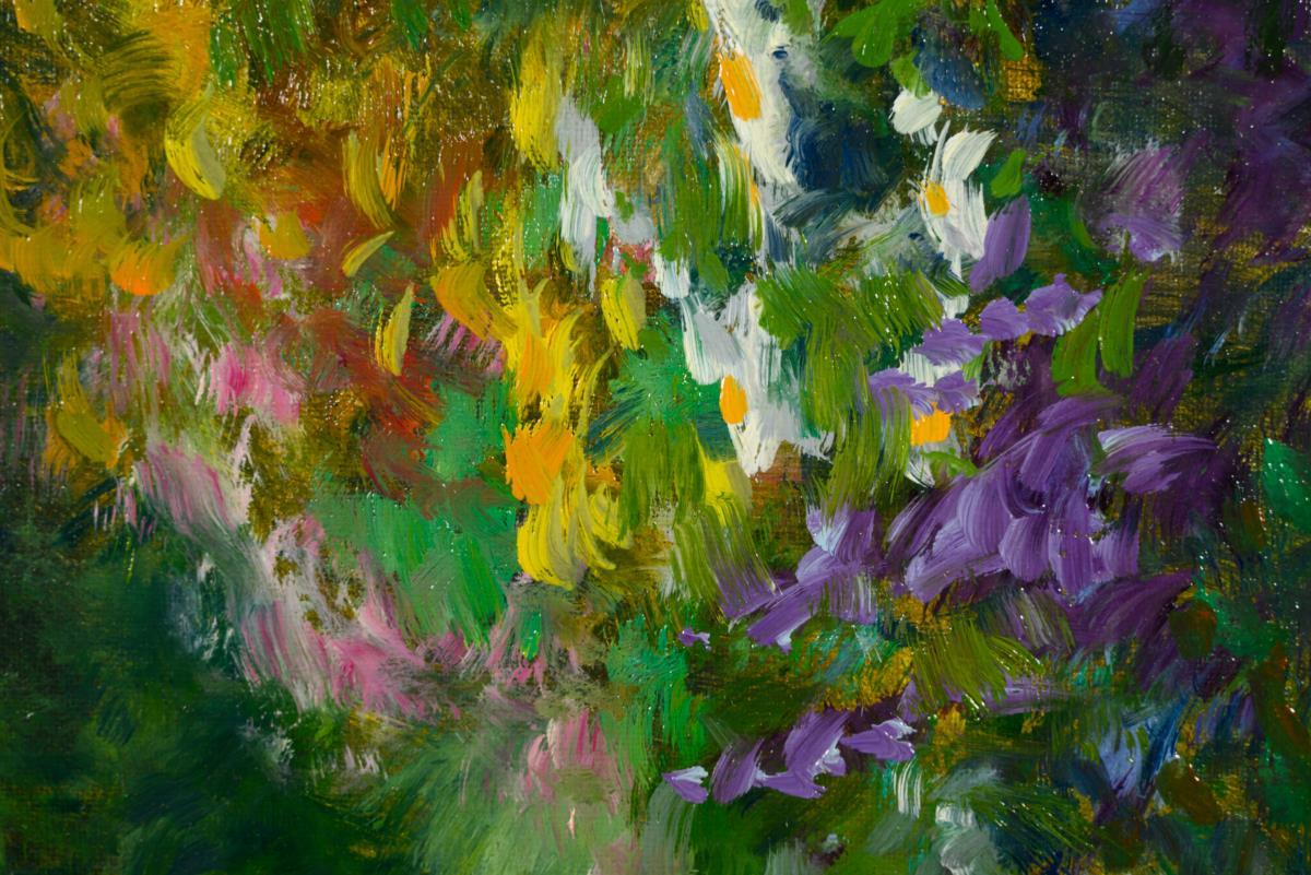 Colorful depiction of various flowers on a green meadow.
