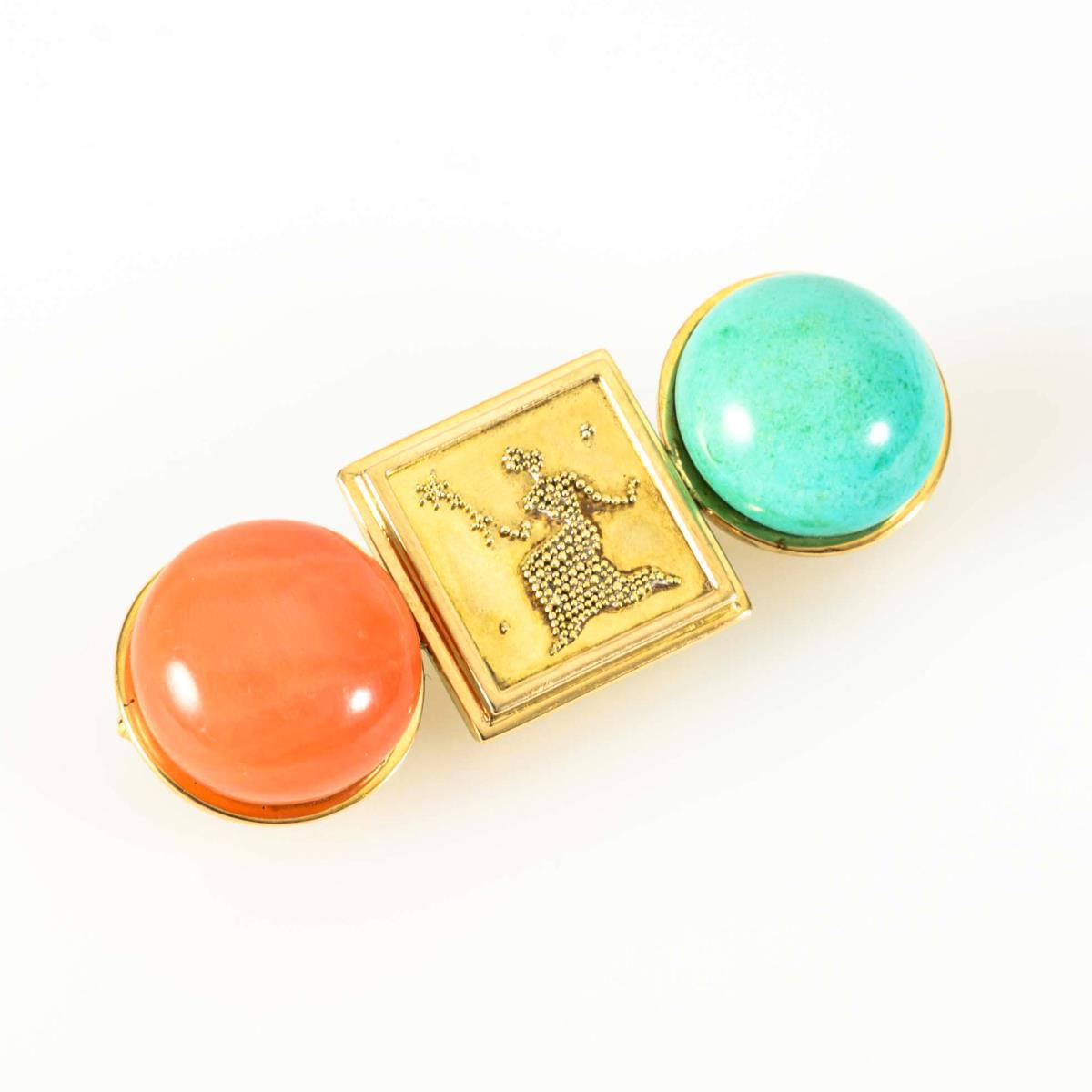 Heavy brooch with bezel-set coral and turquoise cabochon. Granal decoration in the center. Sliding hook. Some flaws in the granules.
