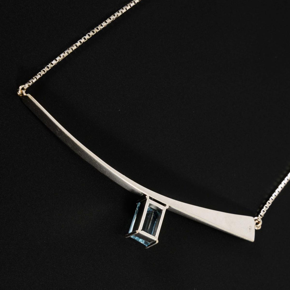 White gold showpiece 750 stamped. White gold chain 585 stamped. Aquamarine 9.9 x 6.4 mm. Approx. 1.7 ct. Centerpiece L 7.5 cm. Necklace L 52.5 cm. 13,0 g.