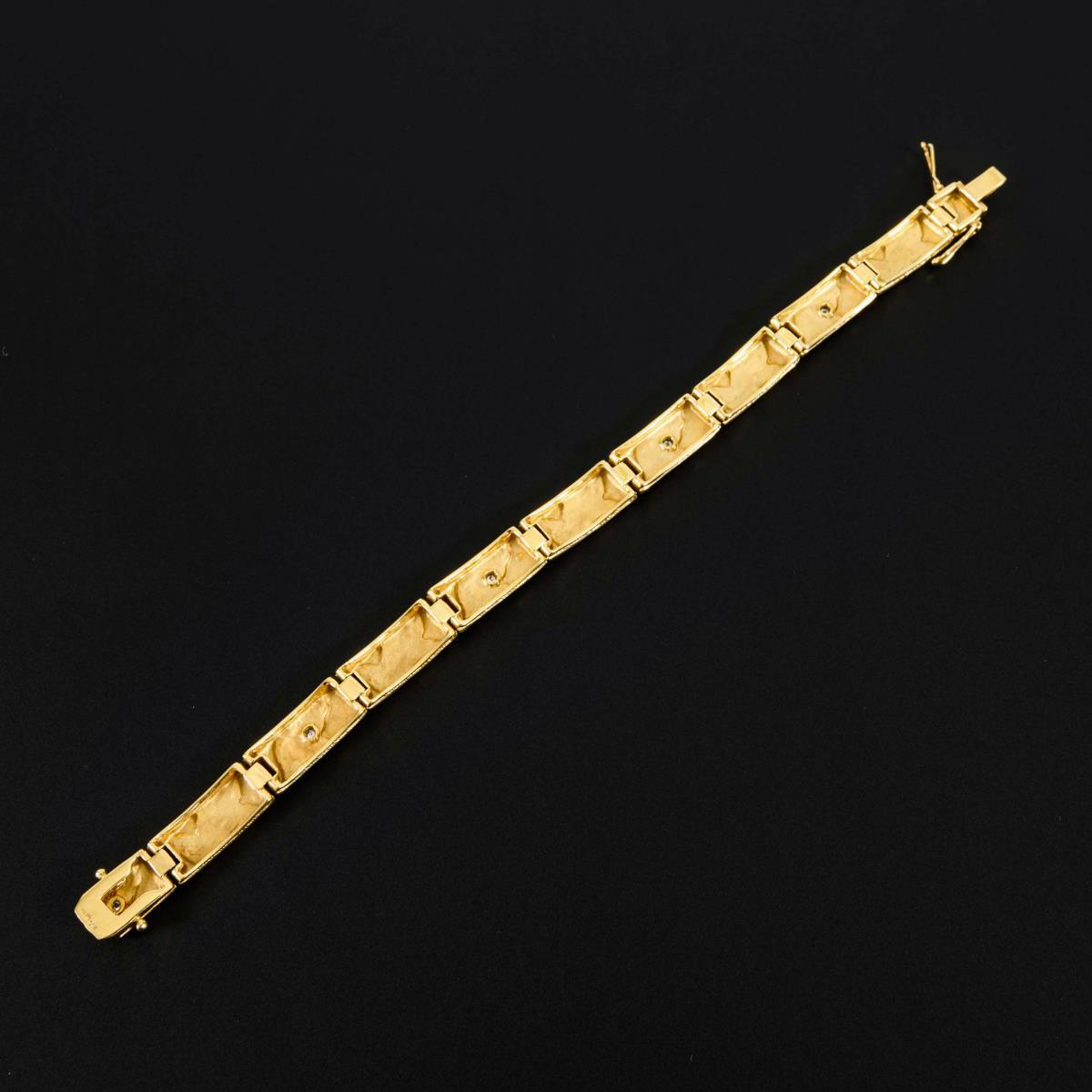 Structured link band with 5 bezel-set brilliant-cut diamonds. Box lock with 2 figure-of-eight safety catches.