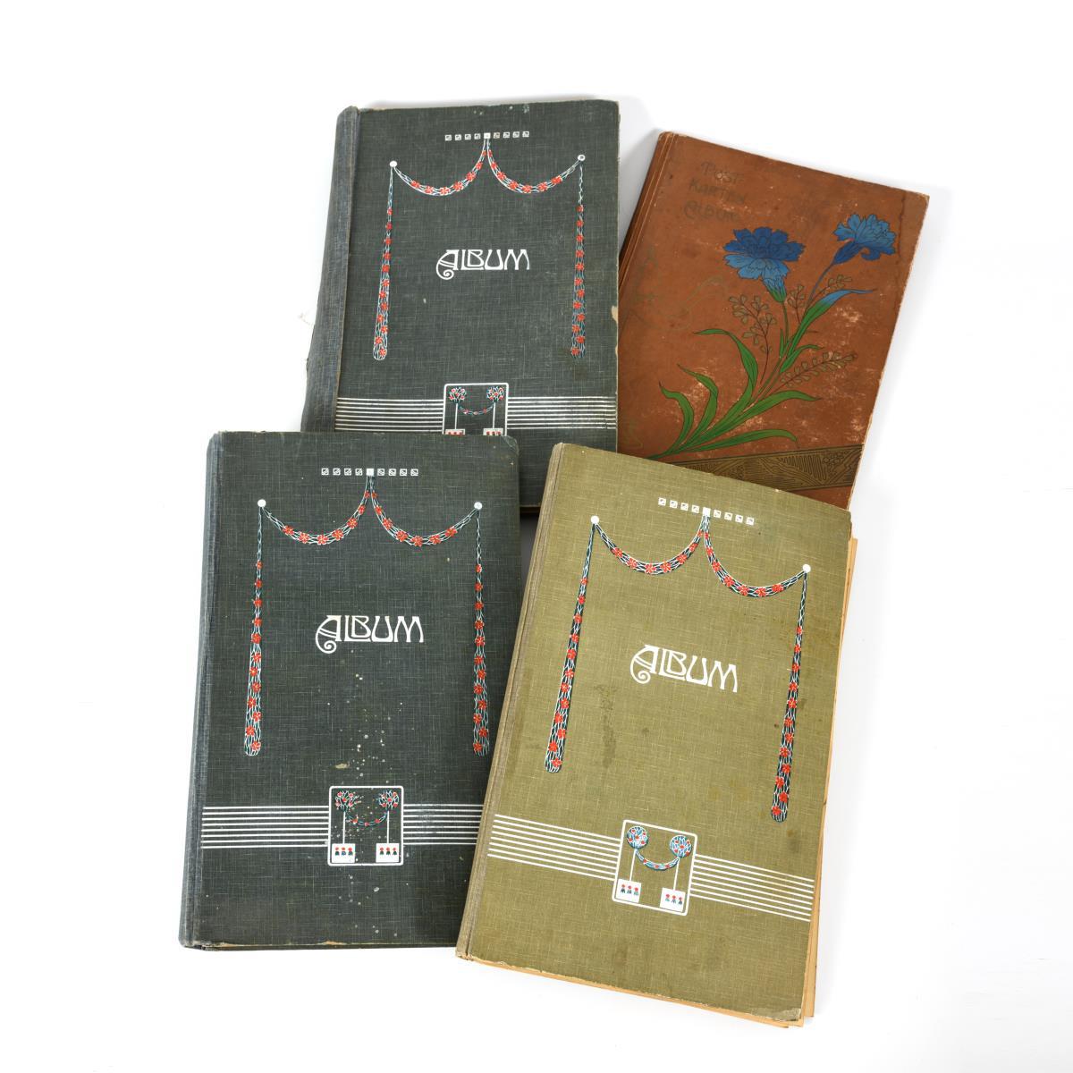 Approx. 385 postcards from one household, in two albums, as well as two empty albums. Many from around 1900 to approx. 1930, mostly topographical views. Albums partly defective.