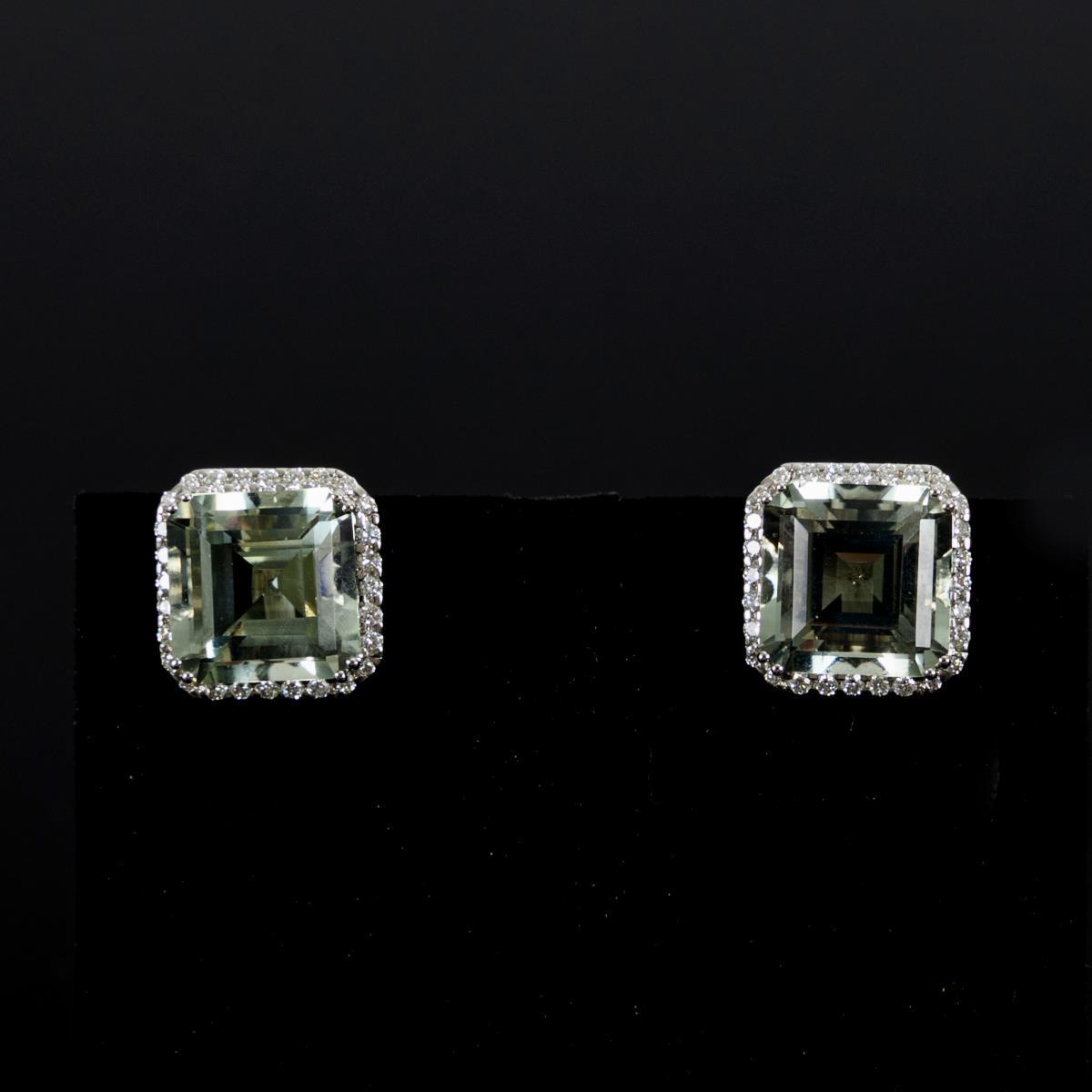 Modern pair of stud earrings with green quartz (prasiolite) and diamonds.
