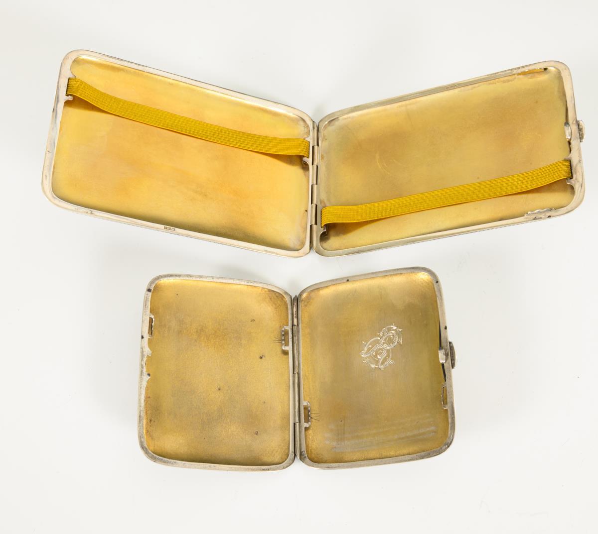 2 rectangular silver cases decorated with a check pattern in niello technique. The smaller one with monogram engraving "ER" inside. Signs of wear, dents.