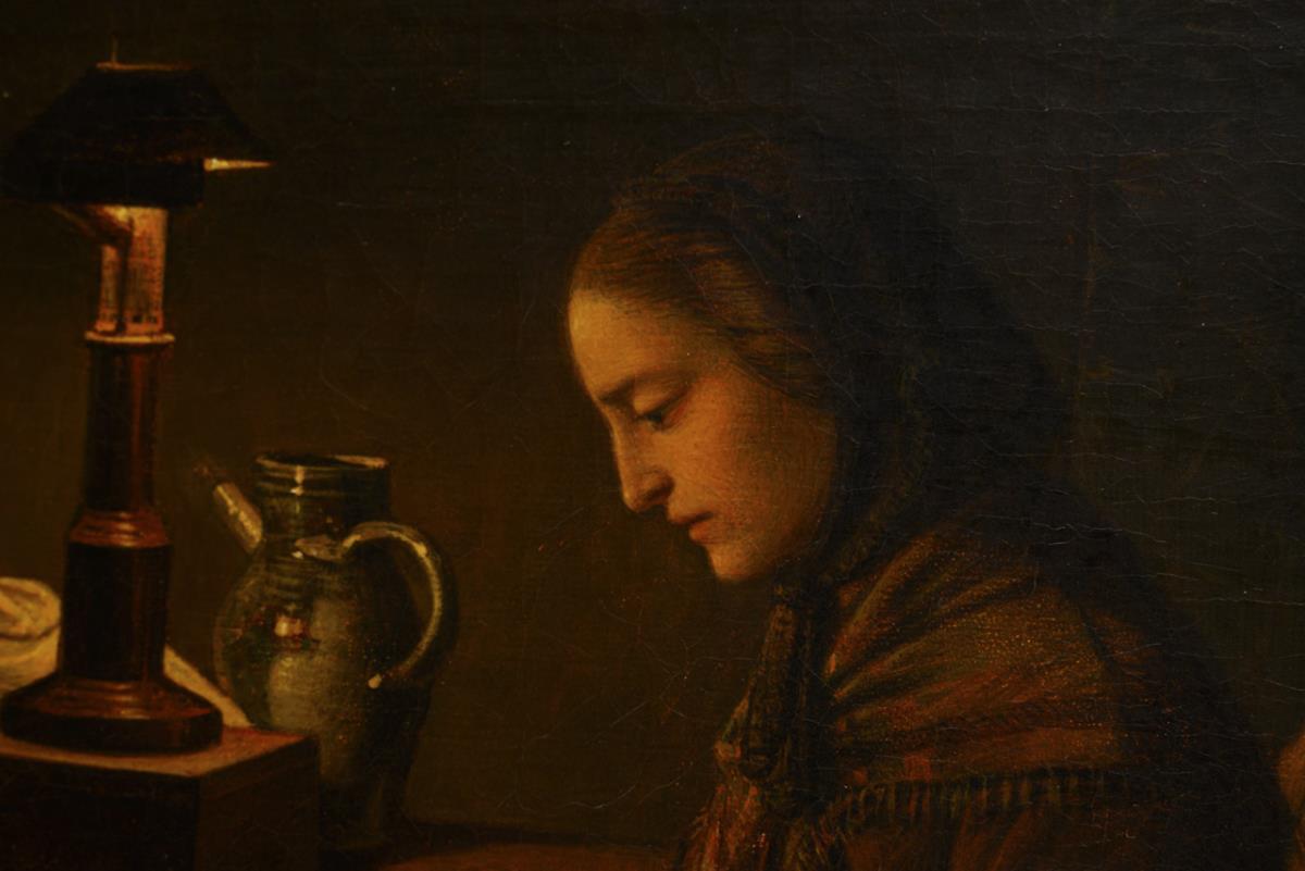 The mother sewing in the light of the lamp next to the bed with the blissfully sleeping children. Doubled canvas.