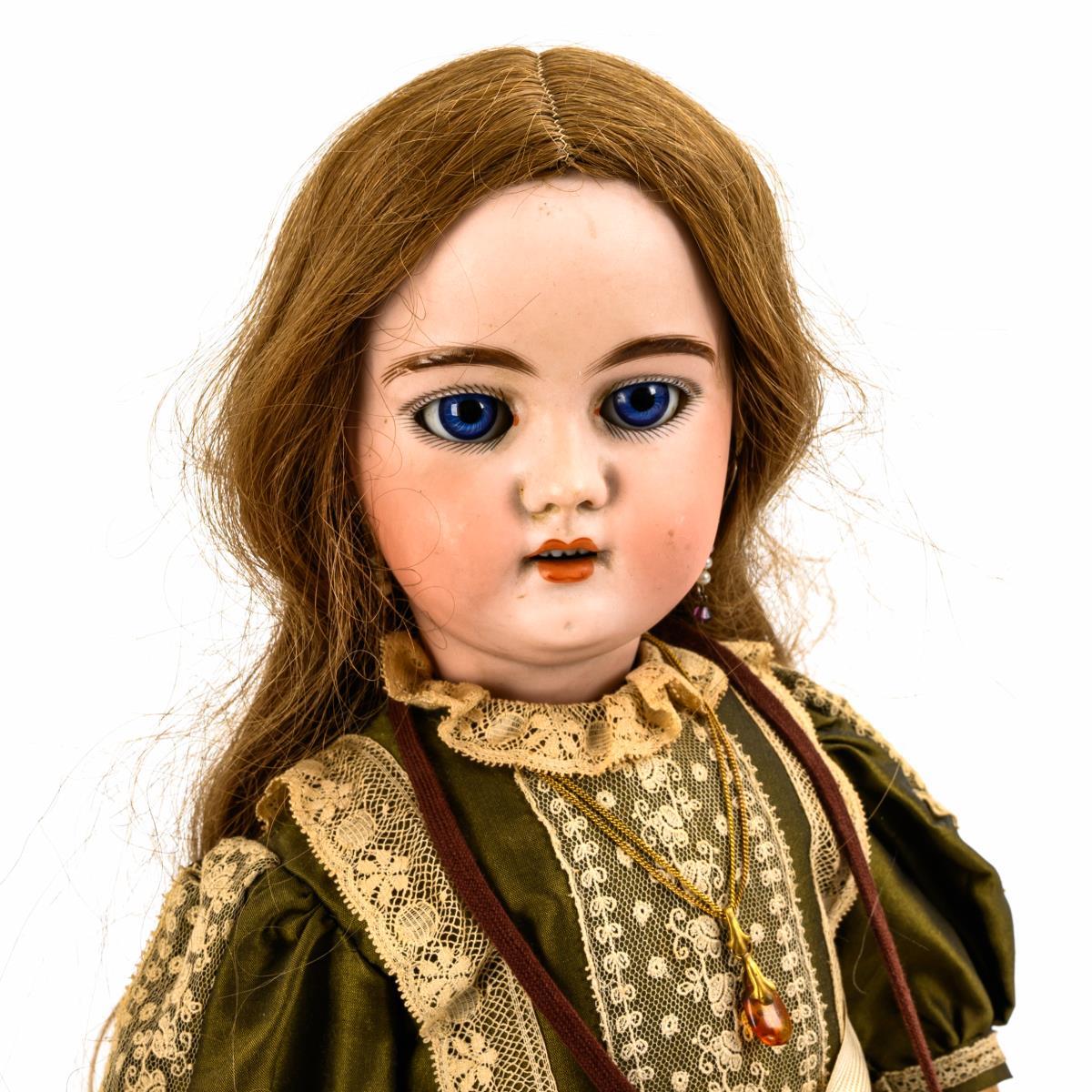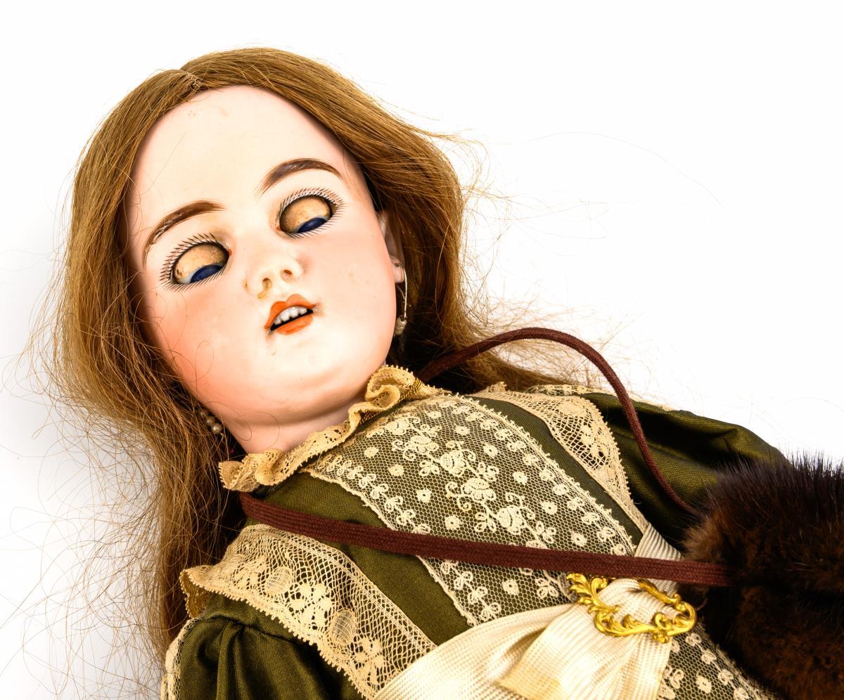 Cranked head, blue sleeping eyes, long brown real hair wig. 15-part jointed body. Olive green dress with lace and muff in old style, stockings, old shoes. Head x-rayed: without defects. 2 fingers glued.