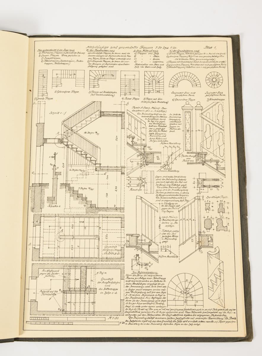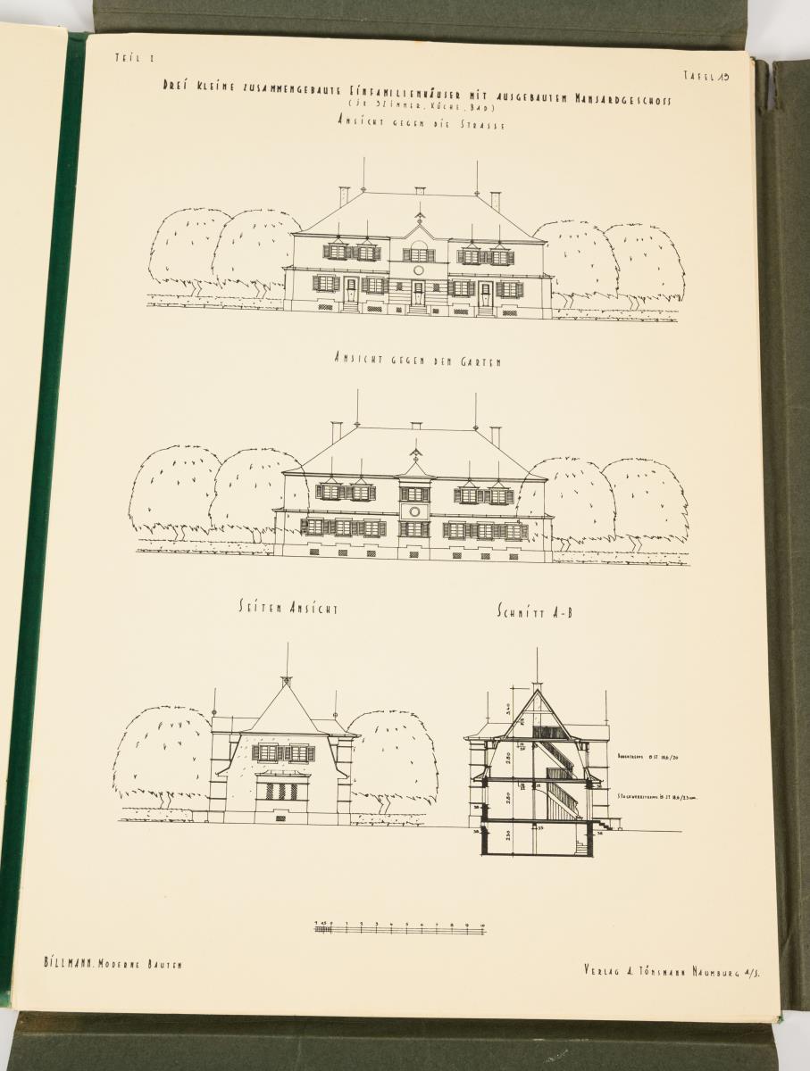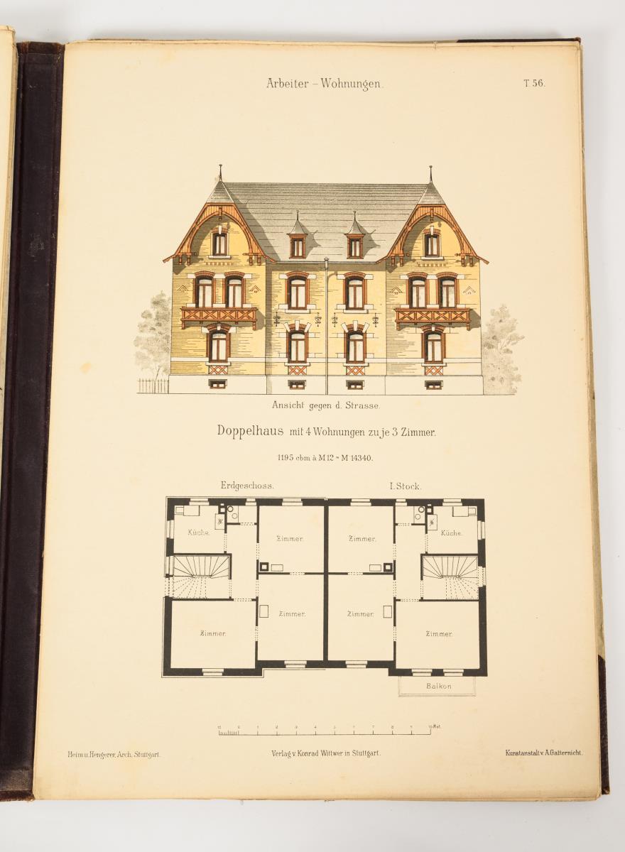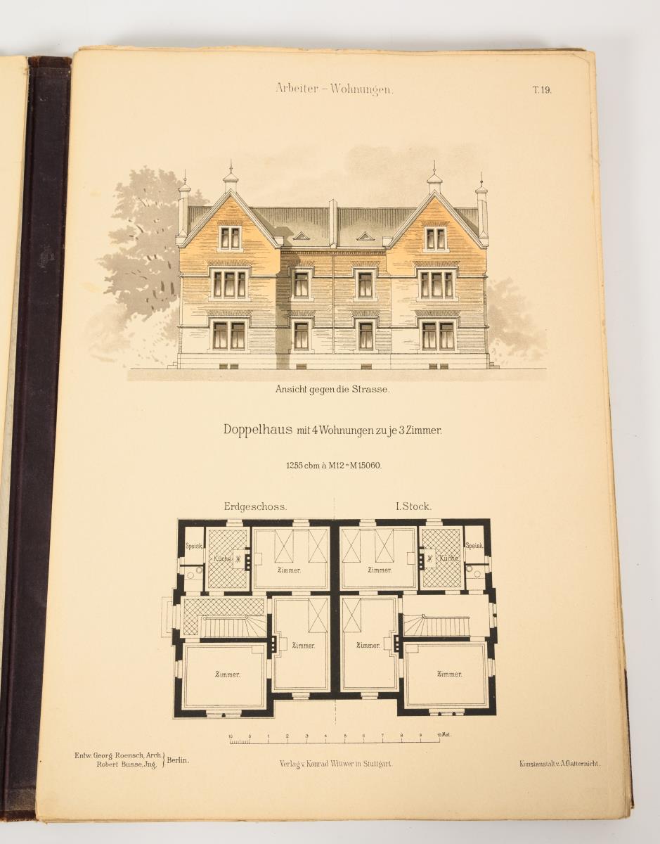 Lambert & Stahl: "Arbeiter-Wohnungen (Privat- und Gemeindebauten. Serie IV.) Einzelhäuser für eine Familie und Doppelhäuser für zwei und vier Familien, in farbiger Darstellung", Stuttgart, no year. With 60 plates in folder / Böttcher; Rohde: "Leitskizzen für den Unterricht in Bauverbandslehre, Klasse III", Eckernförde 1927, 13 sheets / Billmann: "Moderne Bauten Teil I, kleinere und mittlere Einfamilienhäuser", Naumburg. 32 plates in folder.