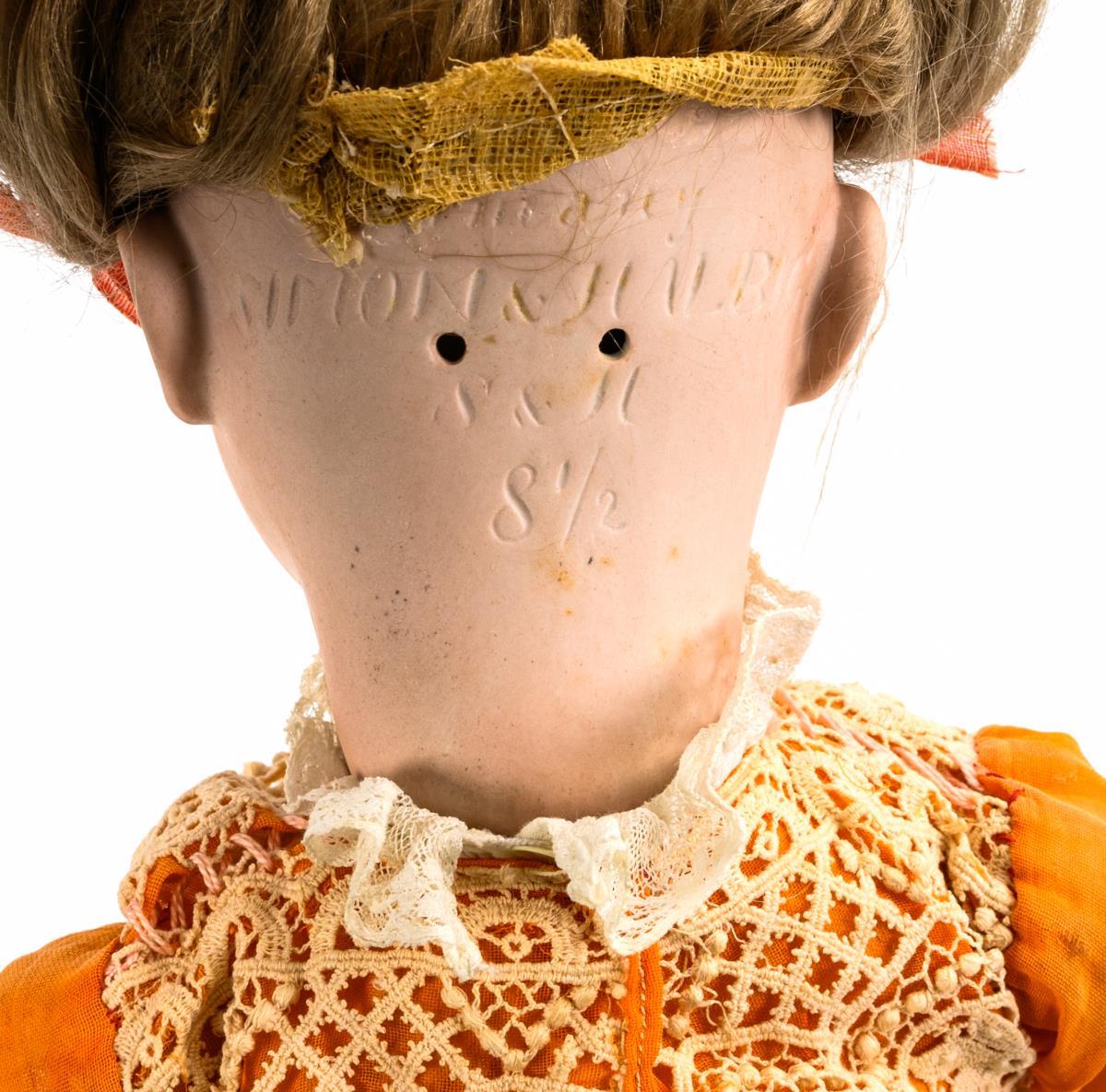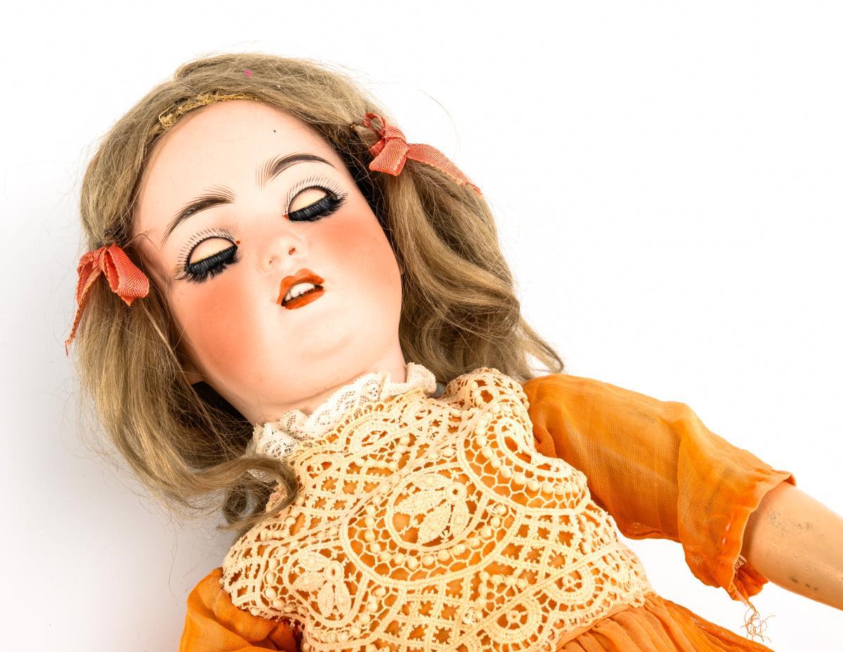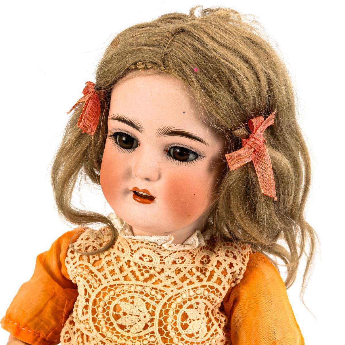 Cranked head, brown sleeping eyes, blond mohair wig. 13-part jointed body. Salmon-colored dress with lace heels, white shoes. Short, barely visible hairline above the left eye, minimal wig pull on the forehead. Body painted over, left hand repaired.