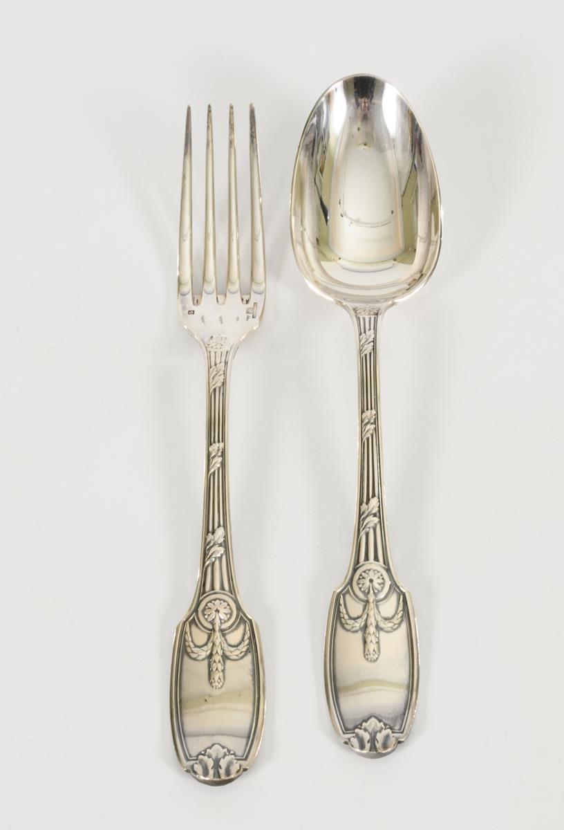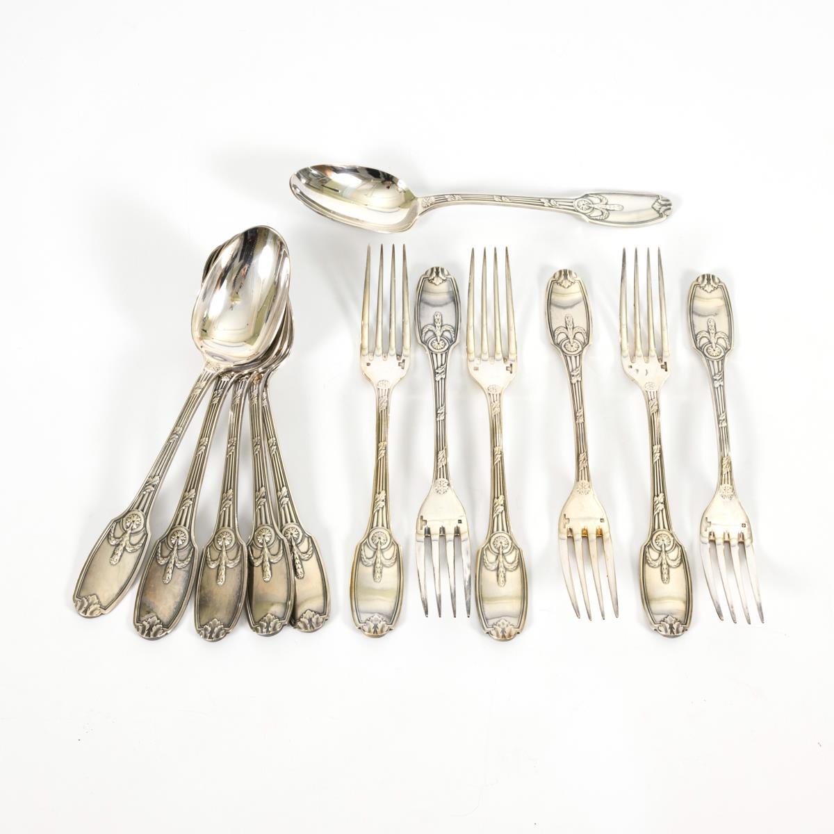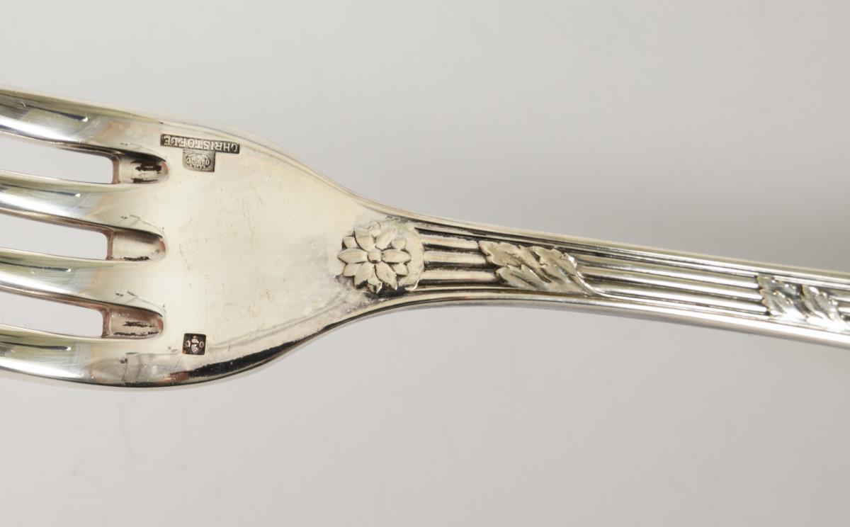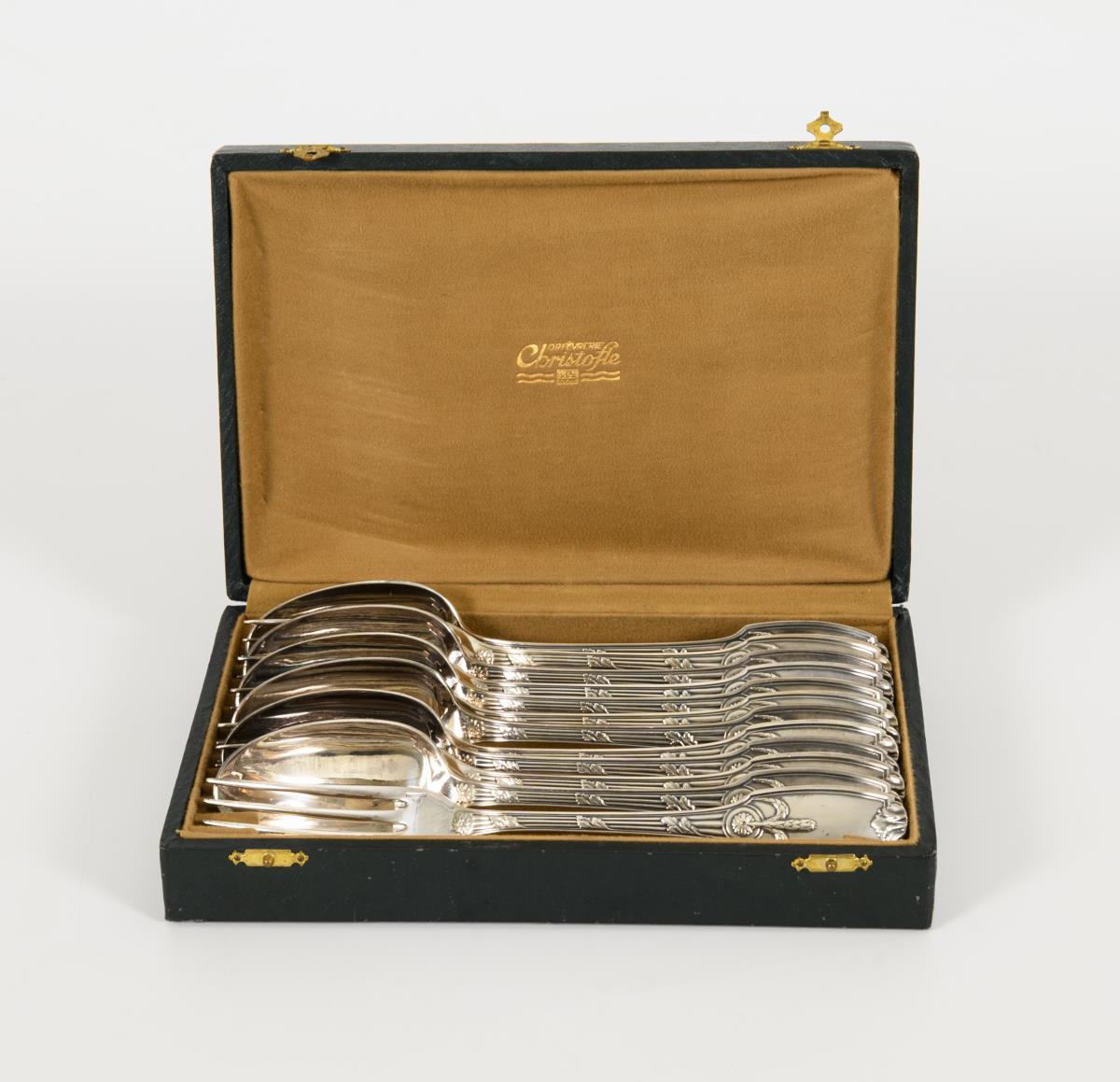 6 dinner forks and 6 soup spoons in original case. Christofle, Paris.