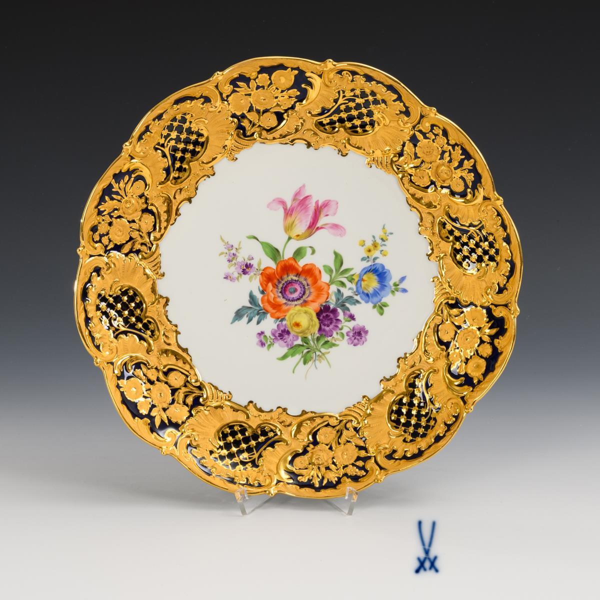 Credenza plate with rich, gold-bronze floral, rocaille and grillwork relief on the cobalt-fond rim, a floral bouquet in the mirror.