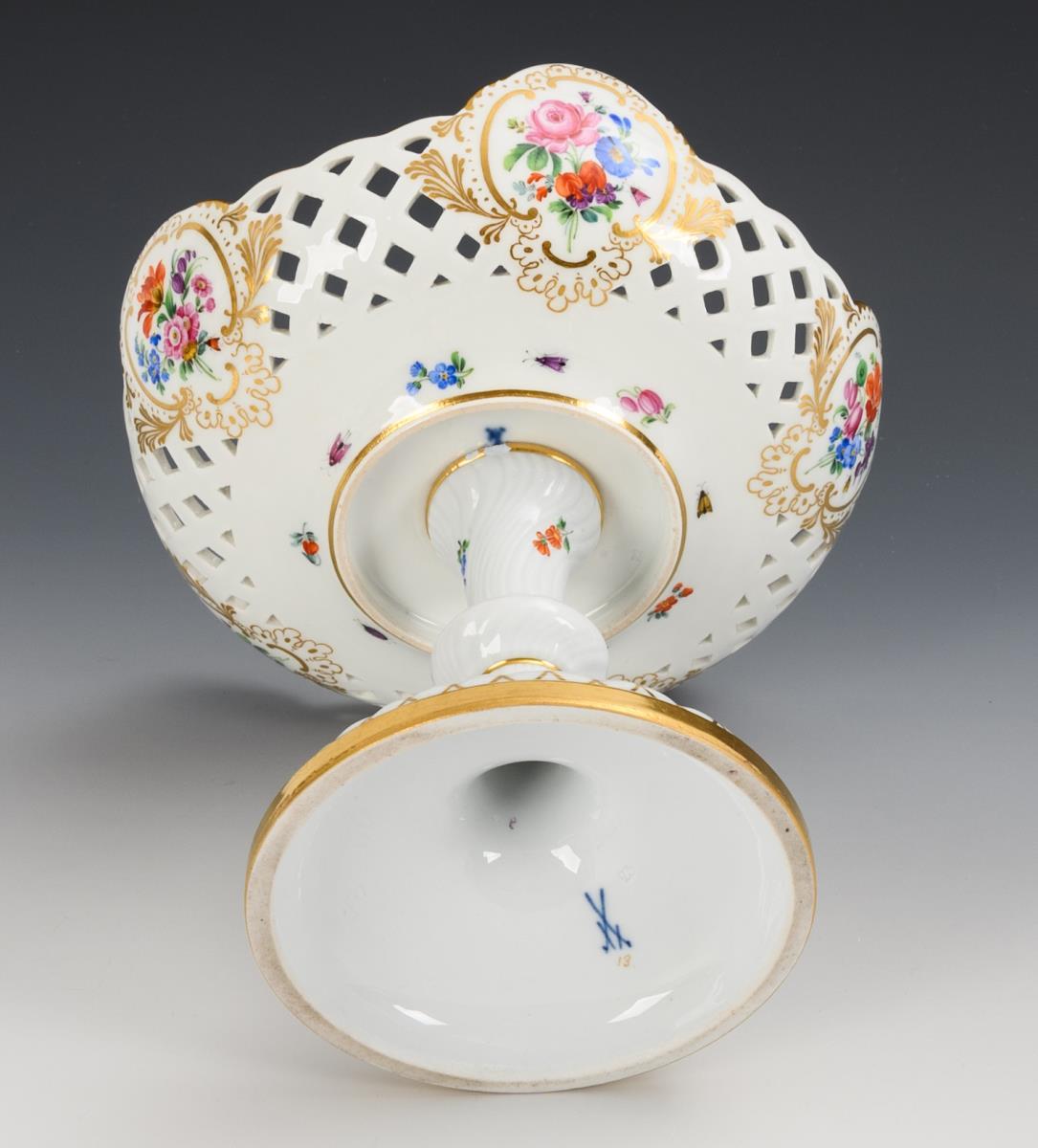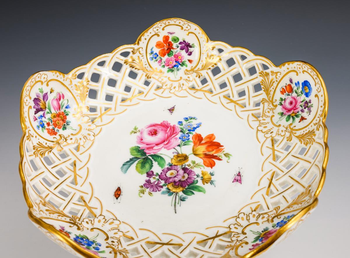 Breakthrough bowl with flower bouquets in the mirror and in the rocaille shields, on a curved gadrooned shaft and foot. Chips on the upper edge of the shaft.