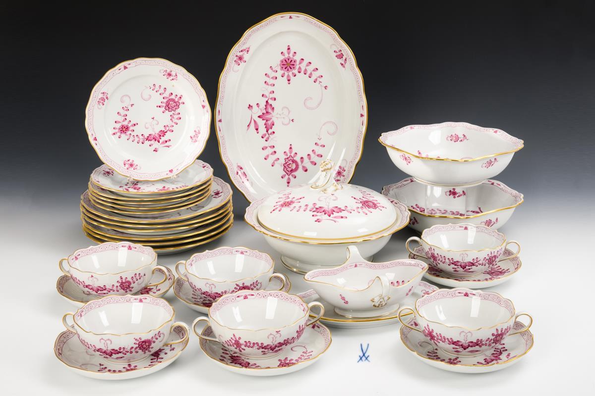 29 pieces. "New cut-out" shape. 6 soup bowls with 6 saucers, 6 dinner plates, 6 salad plates, 2 square bowls (22 x 22 cm), 1 lidded bowl (Ø 26.5 cm), 1 sauce boat and 1 oval platter (L 36 cm).