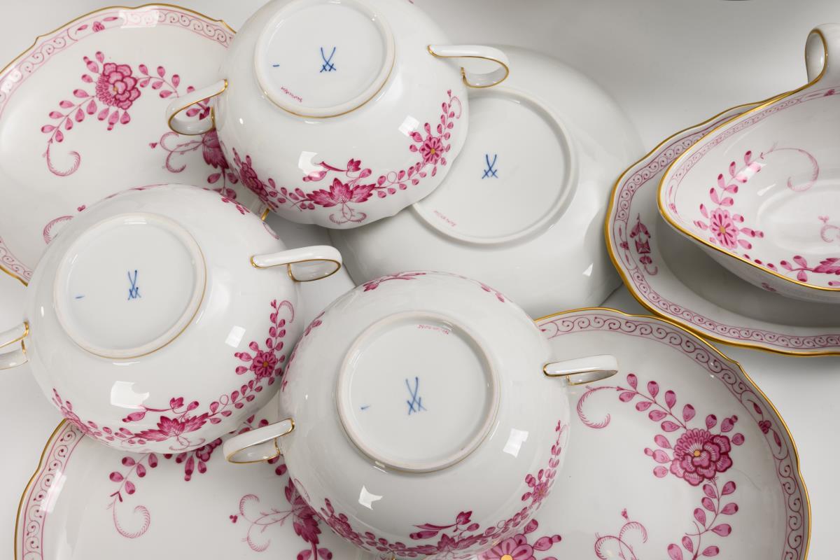 29 pieces. "New cut-out" shape. 6 soup bowls with 6 saucers, 6 dinner plates, 6 salad plates, 2 square bowls (22 x 22 cm), 1 lidded bowl (Ø 26.5 cm), 1 sauce boat and 1 oval platter (L 36 cm).