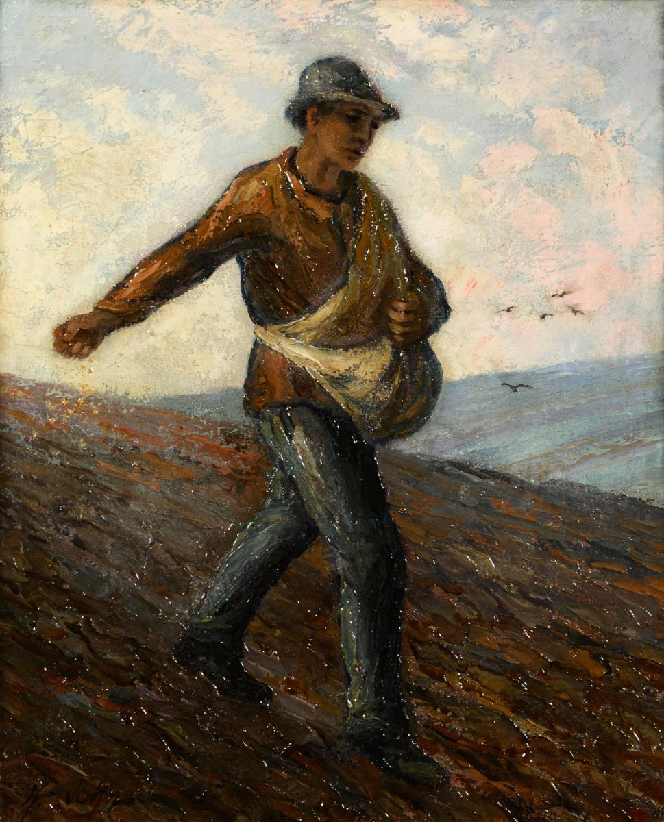 Following van Gogh's example, a young man striding in the field sowing seeds. Slight traces of age.