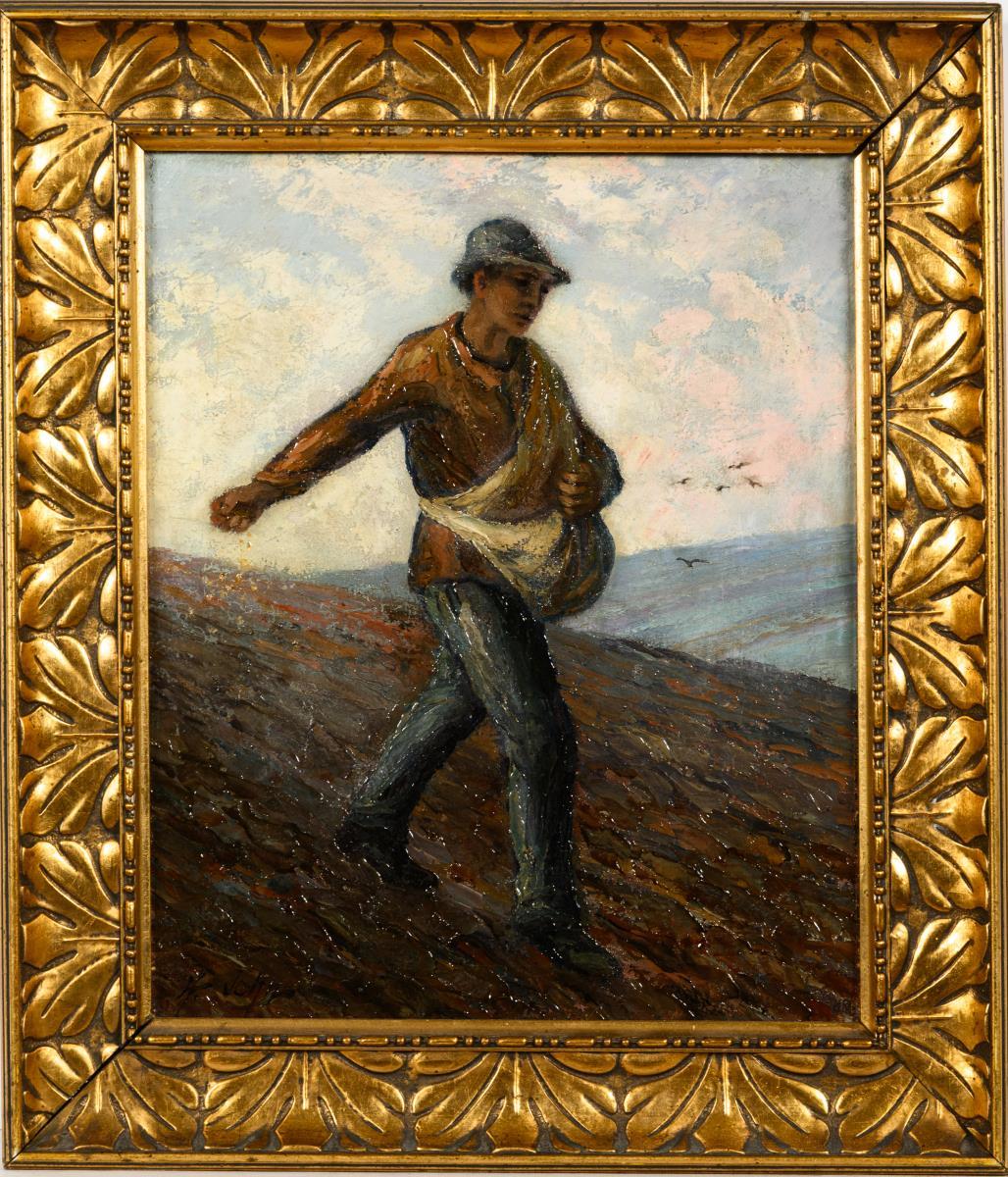 Following van Gogh's example, a young man striding in the field sowing seeds. Slight traces of age.