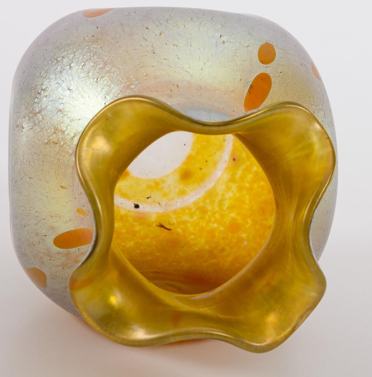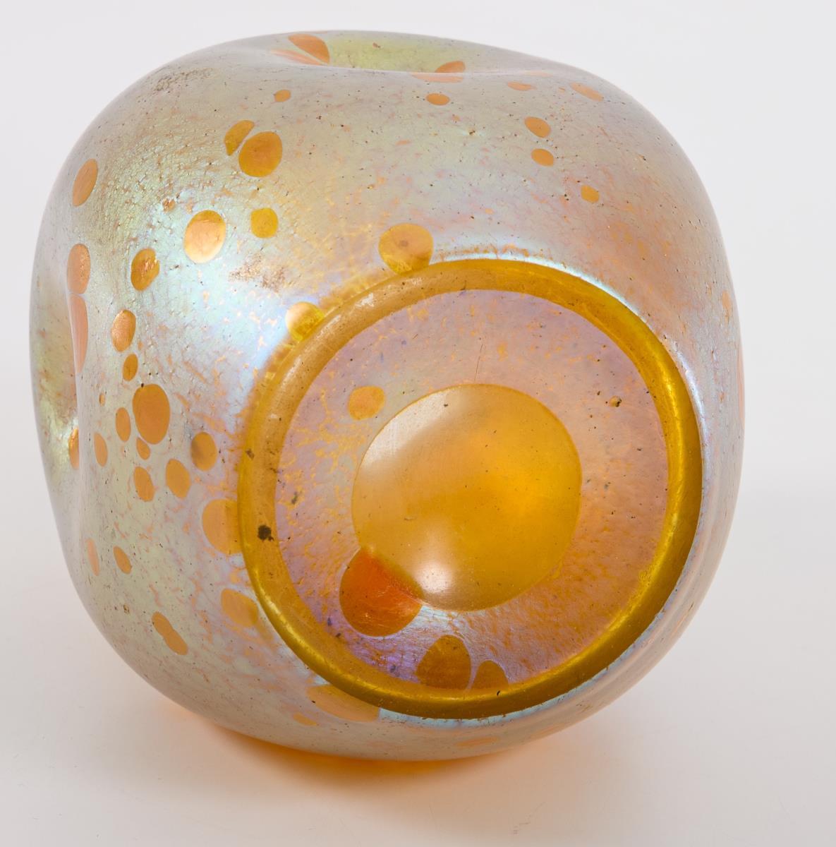 Colourless glass with dense, silver-yellow crumb melting and honey-yellow rolled-in crumbs, iridescent. H 19 cm.