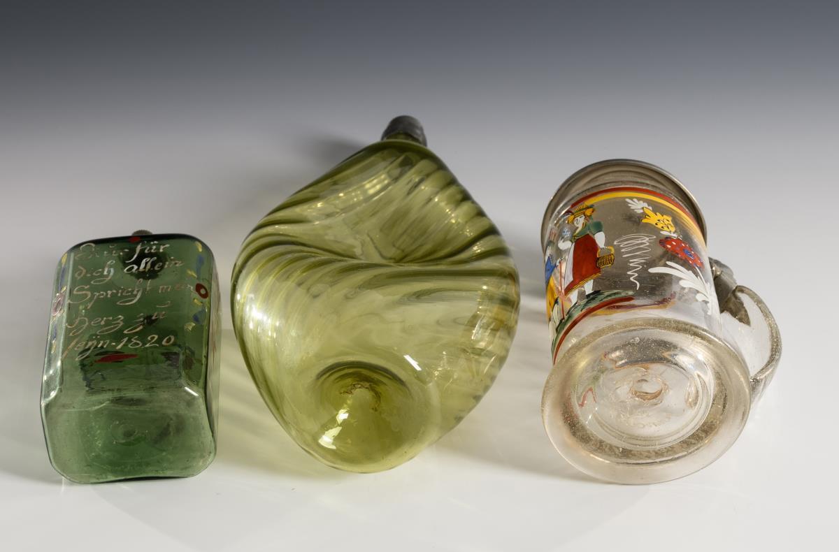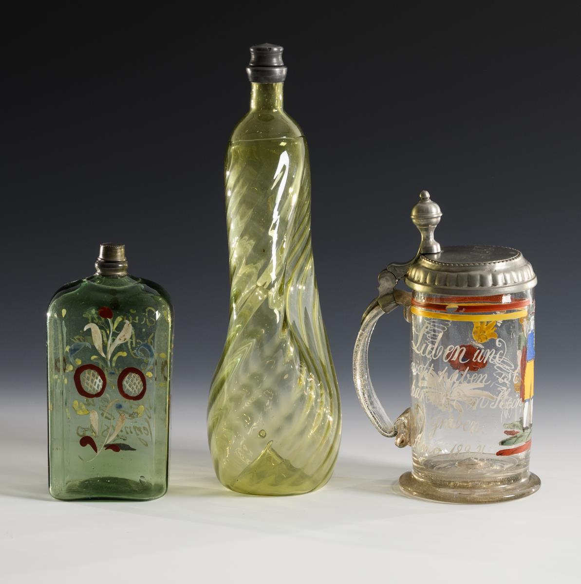 1x South German/Tyrol: slant-blown clutch bottle made of olive green glass with raised base and dented "navel" in the middle; with tear-off and pewter stopper (l 28.5 cm). / 1x Biedermeier cylindrical jug of colorless glass with ribbon handle and pewter-mounted hinged lid; the front with a polychrome enamel-painted couple and the motto "Lieben und nicht haben, ist härder den Steingraben. Anno 1834"; tear-off (h 19 cm). / 1x alpine: Brandy bottle made of green glass with pewter screw cap; on the front the saying "Nur für dich allein Spricht mein Herz zu seyn. 1820"; tear-off (H 16 cm).