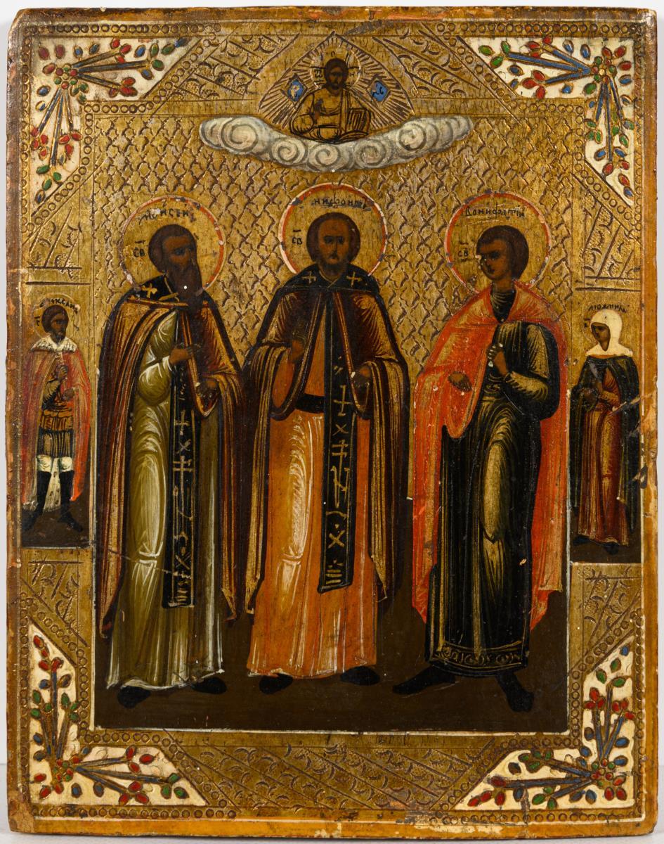 Three holy men flanked by two further saints at the edges and Christ in heaven above.
