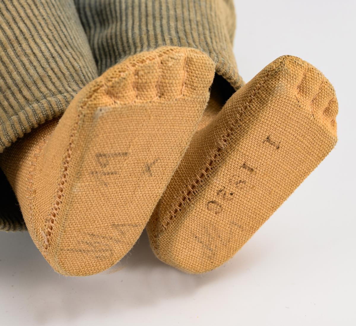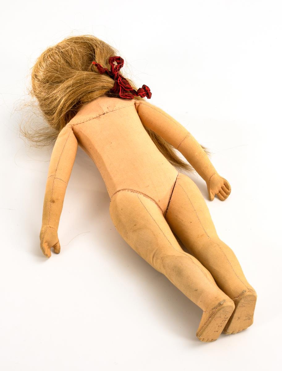 Plastic crank head, painted blue eyes, blonde real hair wig. Slim fabric body. Striped knitted sweater, light blue dungarees made of corduroy, white shoes. Face with small bumps, body somewhat soiled in places.