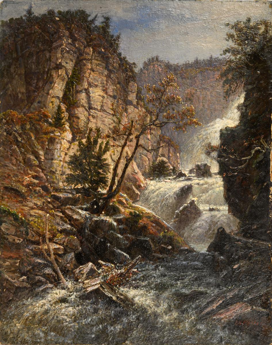 Large waterfall between steep rocks with the sun shining through the cloudy sky. Slight traces of age.