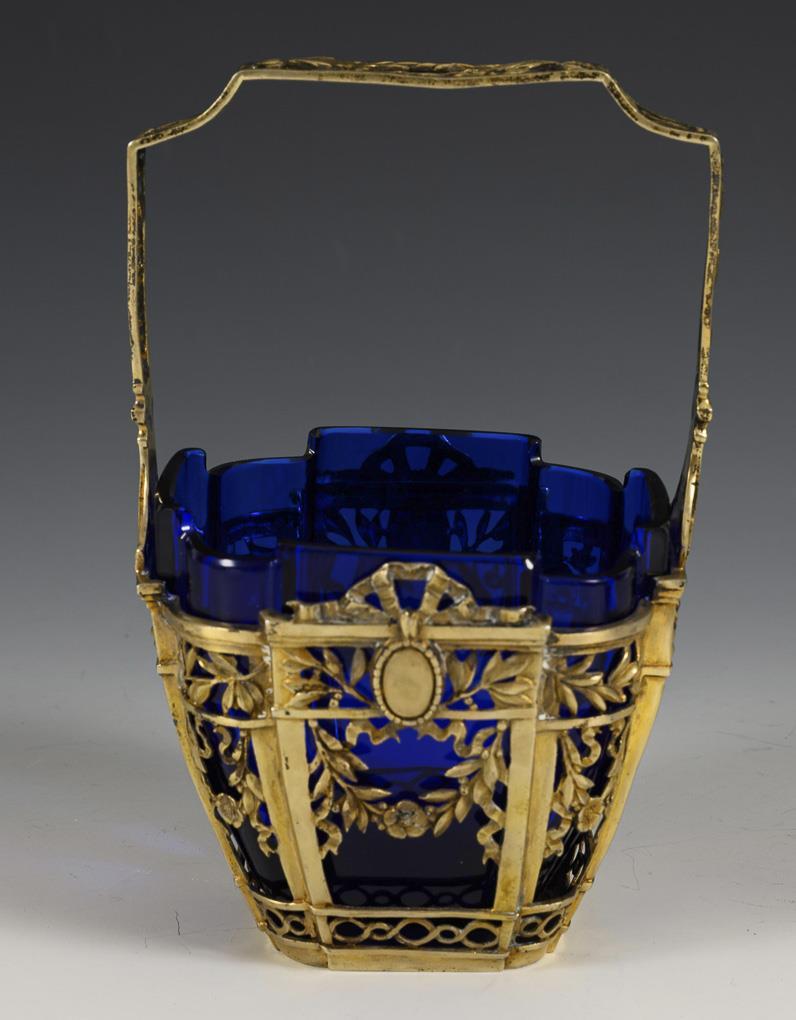Open-worked handle baskets with garlands and laurel leaves, each with cobalt glass insert. Minimal signs of age.