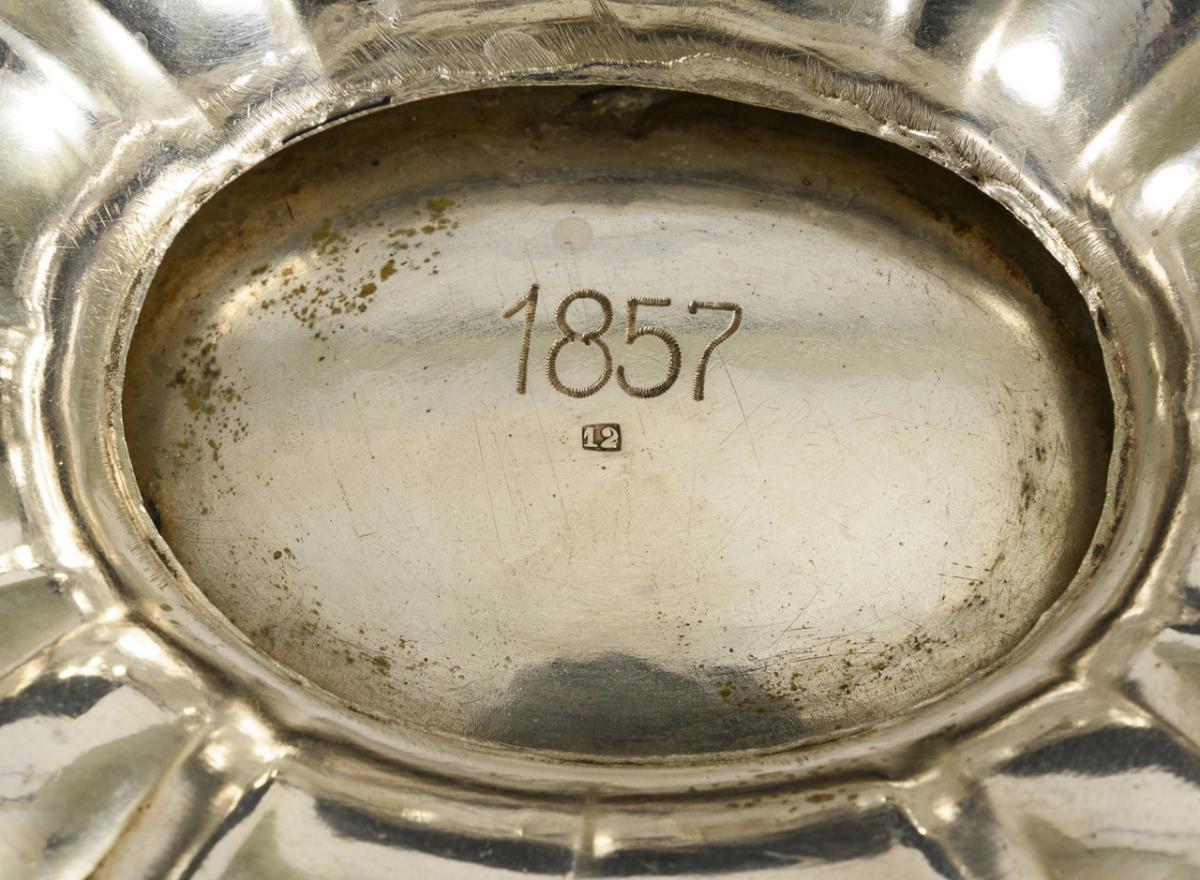 Oval footed bowl with curved relief rim and bow handle. Handle with soldered joint.