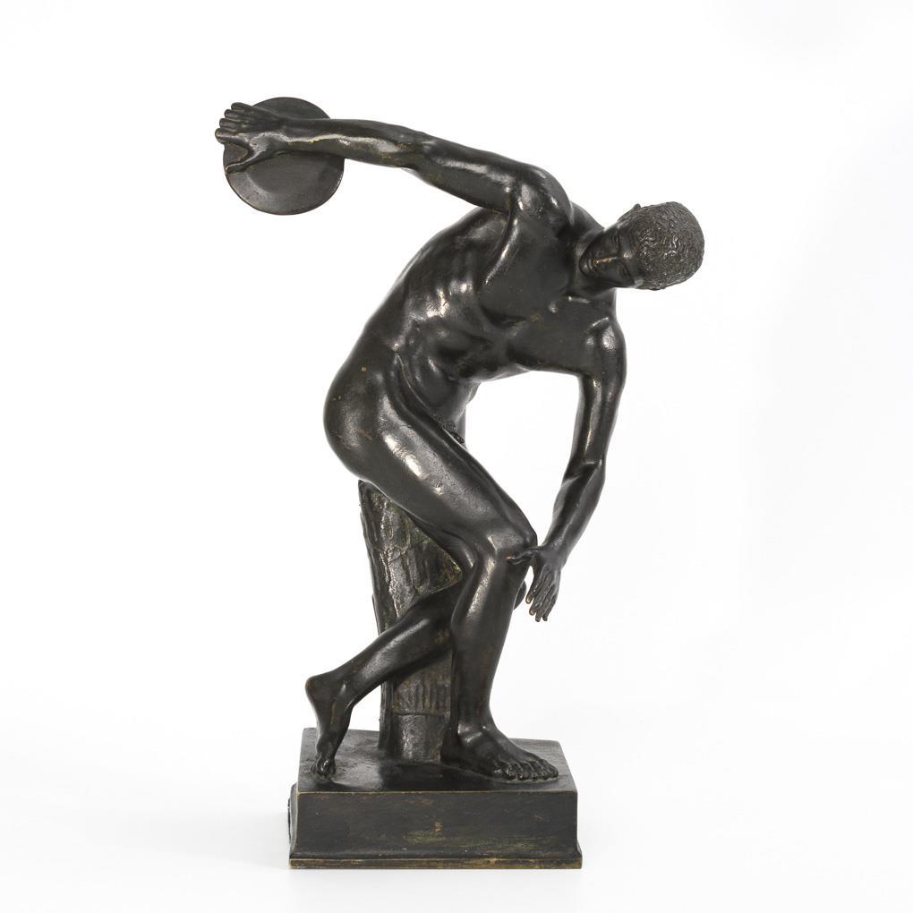 Finely executed discus thrower on a rectangular bronze plinth and with the support of a Roman marble copy. Patina rubbed, plinth somewhat warped.